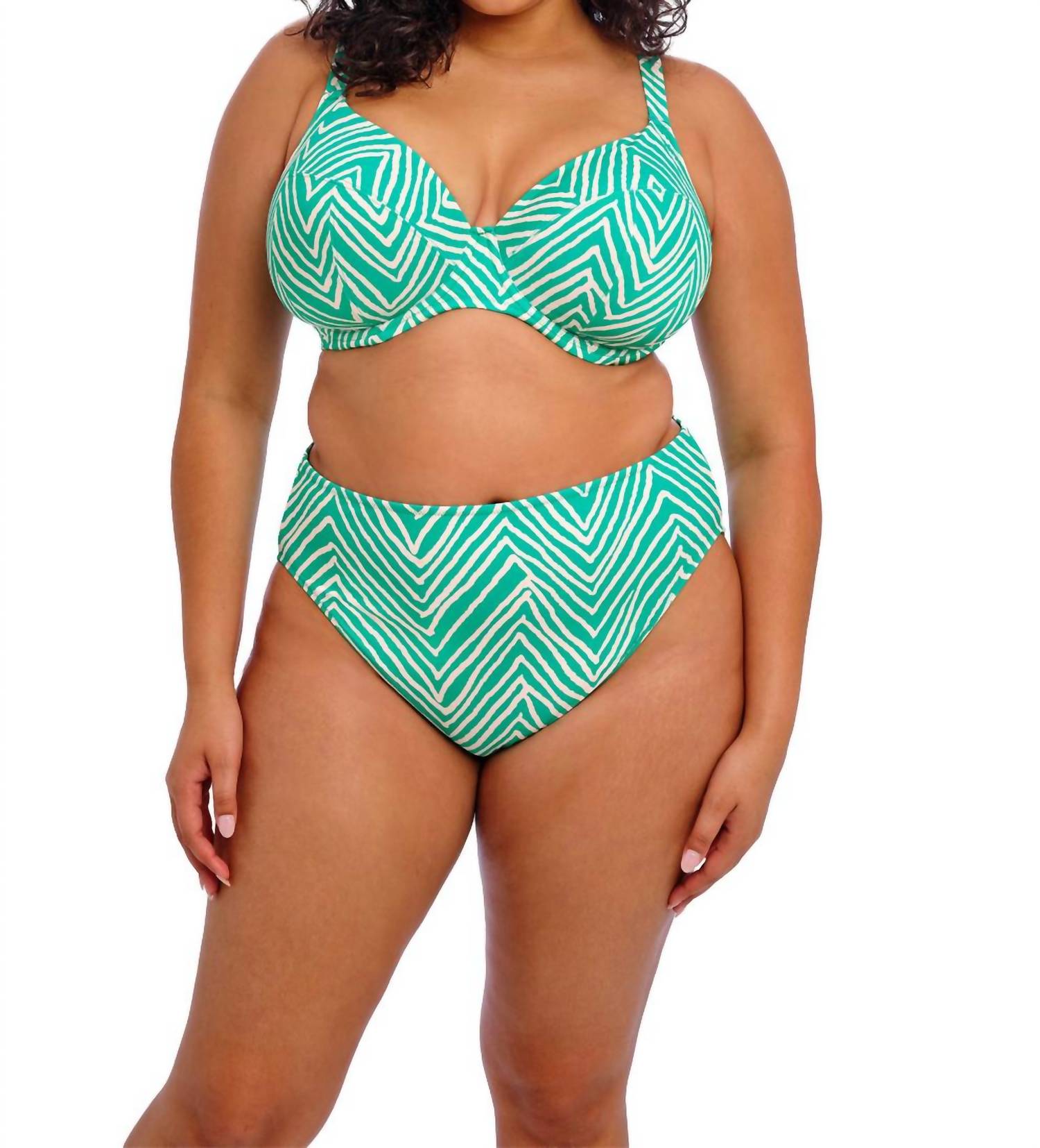 Ideal for relaxed poolside moments, this adorable swimsuit effortlessly transitions into the perfect sunset dinner outfit when paired with a flowing skirt. Dive into summer with the Elomi Fiji Falls Plunge Bikini Top in a vibrant Marine shade, inspired by ocean waves. This bikini top features adjustable length shoulder straps and a supportive powernet back for a perfect fit, mirroring the comfort of Elomi lingerie bras. Made from lightweight Polyamide, including LYCRA® XTRA LIFE™, it offers durability and a stylish aqua and ivory pattern. Ensure longevity by opting for a recommended hand wash.