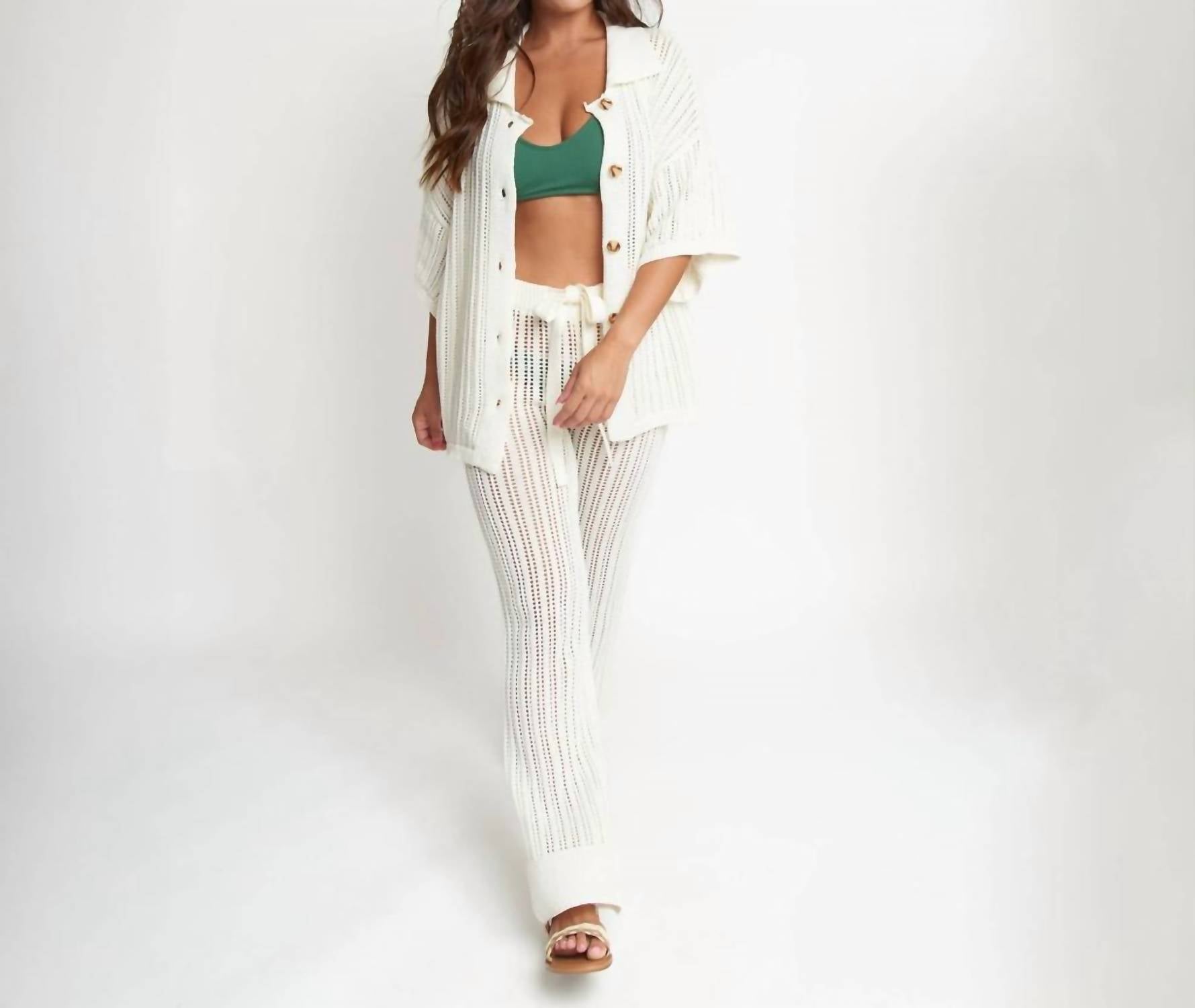 A versatile blouse that works from desk to dinner! Introducing the Catalina Knit Short Sleeve Top by Elsie & Zoey, a cream-colored blouse epitomizing relaxed elegance with its Boho Chic vibe. Crafted with elbow-length sleeves, this textured cover-up features an inviting open-knit design that pairs perfectly with its button closure. Made in China, the top boasts a collar neckline and is ideal for a beach day or a laid-back outing. Care: Hand wash.