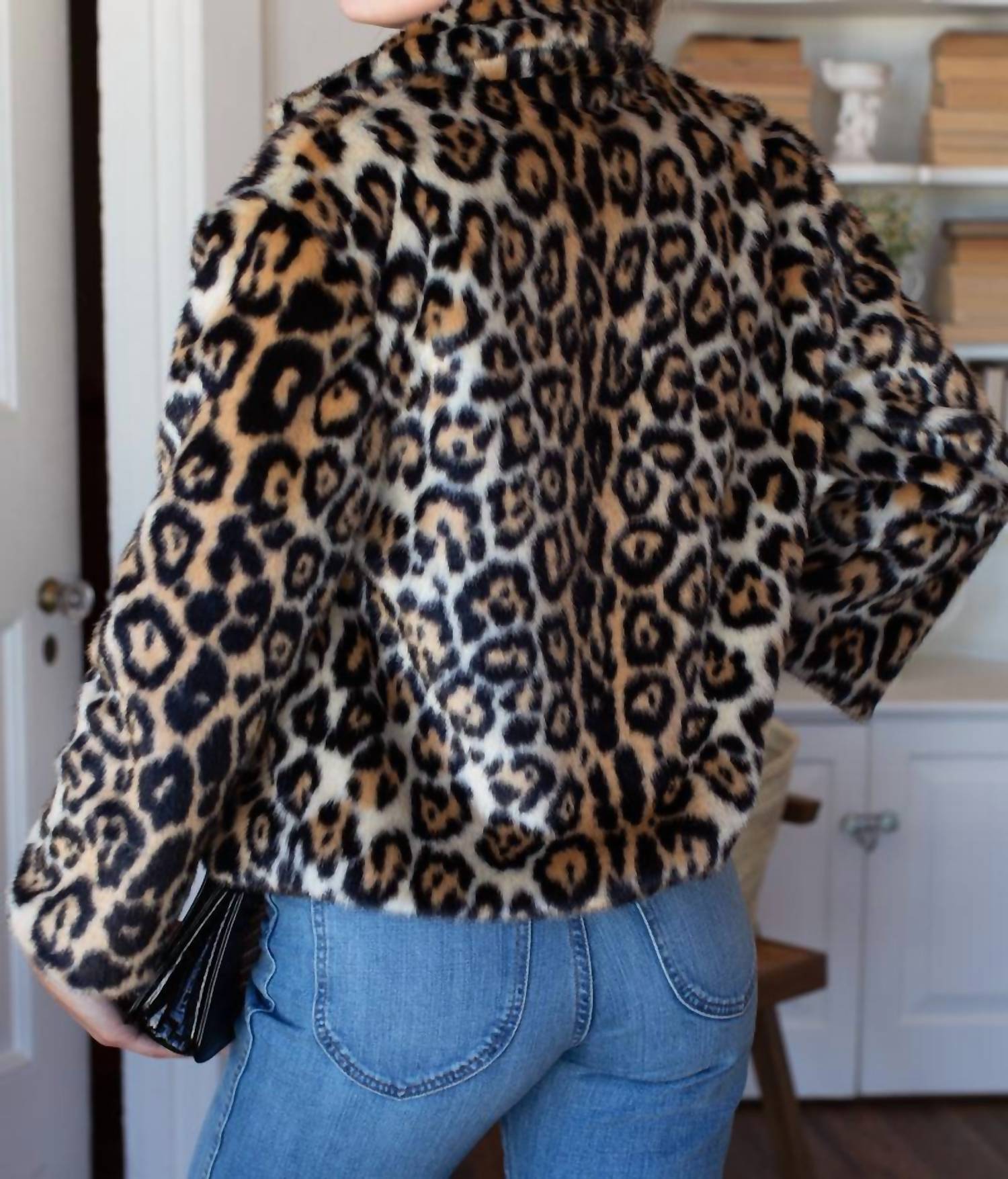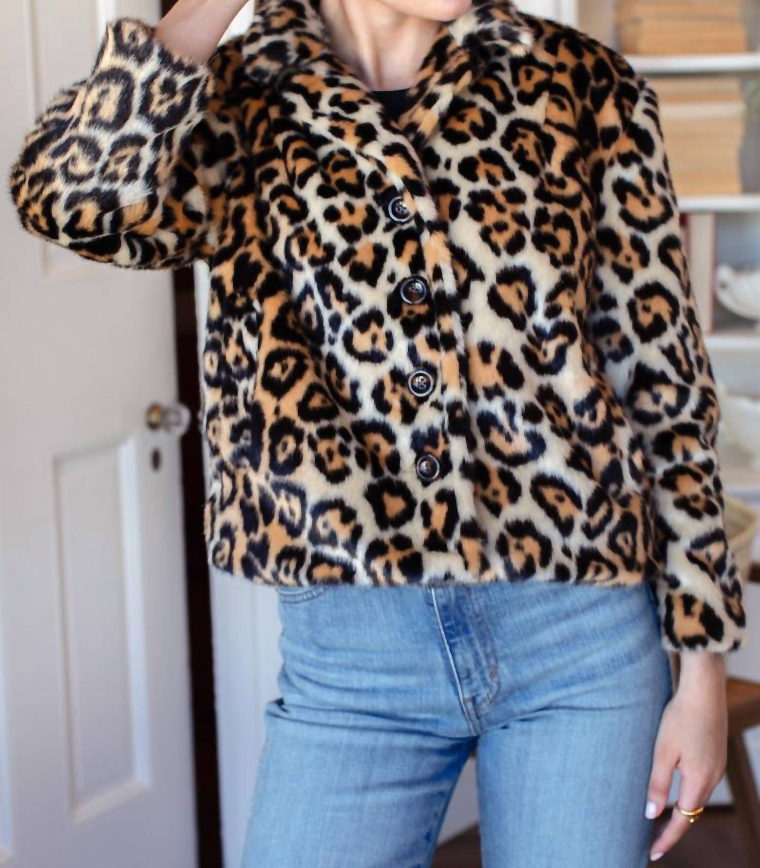 Bundle up in this adorable teddy jacket that'll have you wishing for colder temps. Elevate your style with the Emerson Fry Short 60s Coat, a nod to retro glamour in eye-catching leopard fur. This women's teddy jacket features long sleeves and is crafted from soft faux fur, making it cozy for winter evening events. With a chic collar, it offers both front button closures and practical welt pockets, delivering a standout look. Made in NYC, this modern vintage piece requires dry cleaning for maintenance.