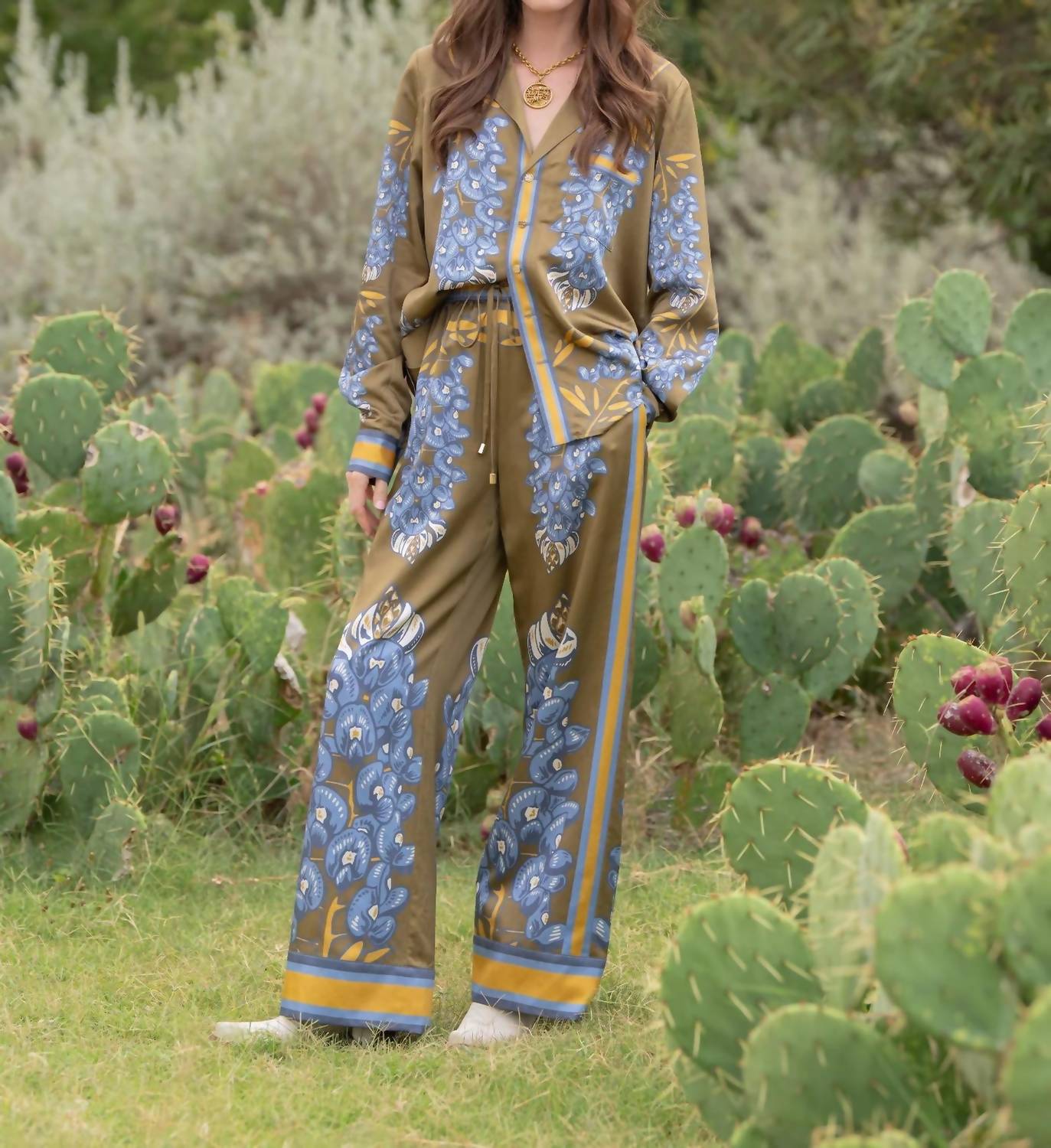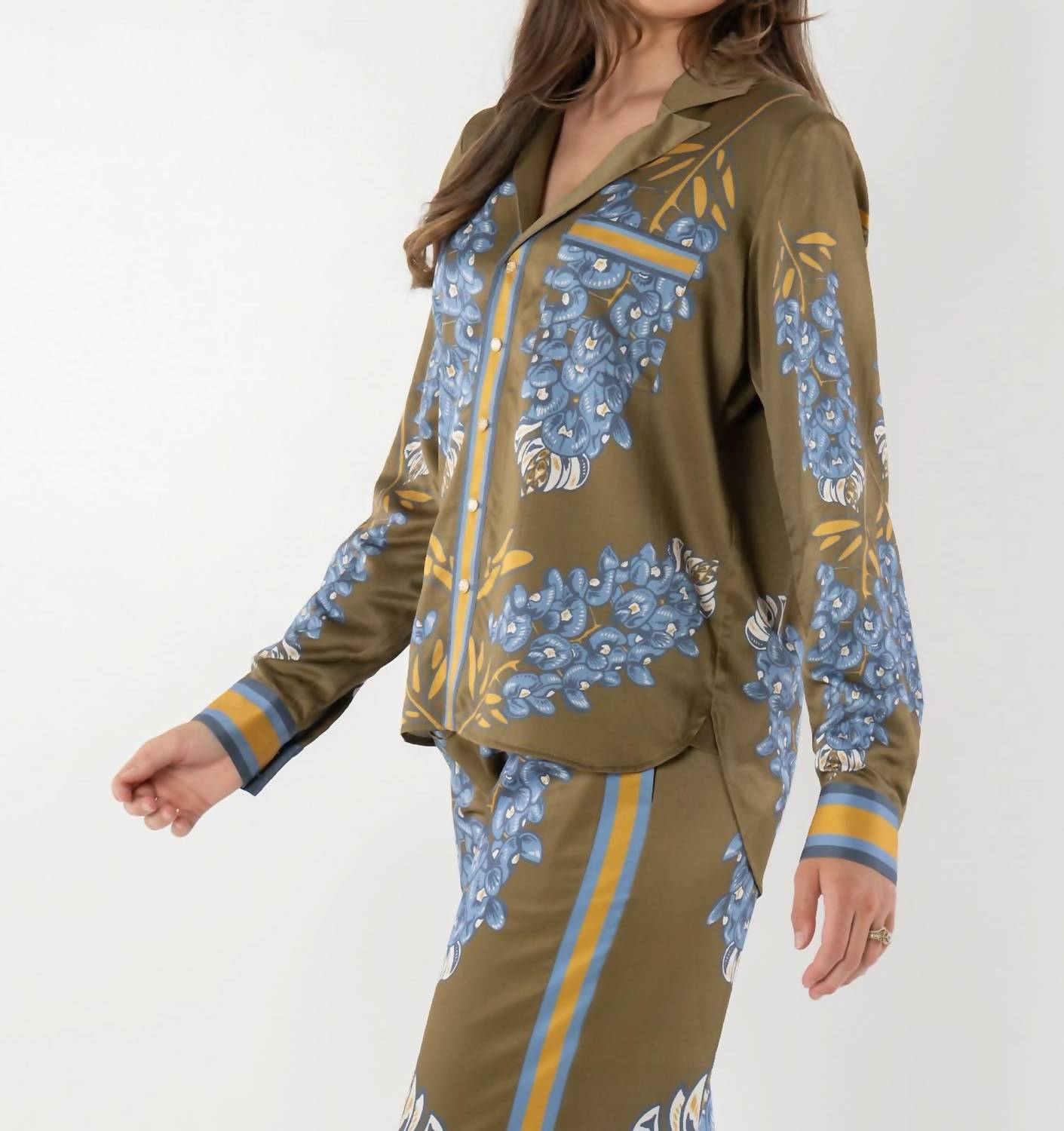 A classic button down shirt that will never go out of style. The Austin Long Sleeve Top by Emily McCarthy is a refined piece featuring the iconic bluebonnet print with coordinating trim. Made from a silky blend of 59% Silk and 41% Cotton, this top boasts a classic fold collar and front signature gold button closure. Its relaxed yet slightly tailored silhouette is complemented by front patch pockets. Care for this garment by hand washing with a gentle detergent in cold water and line drying to maintain its vibrant color and shape.