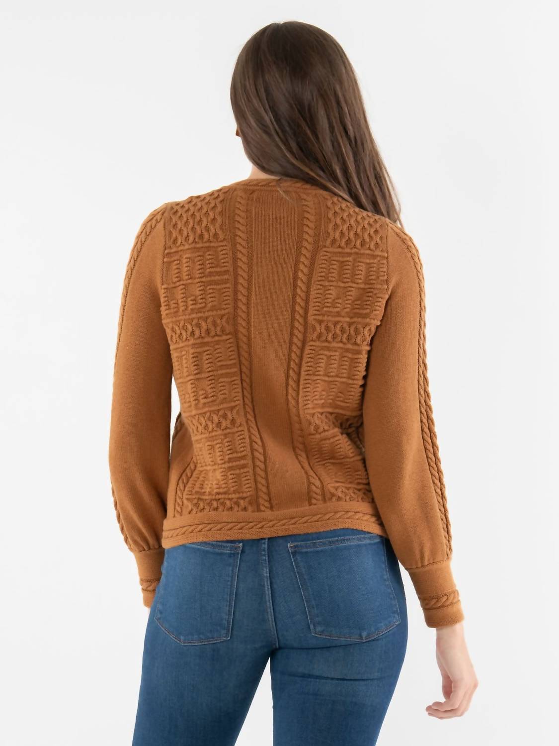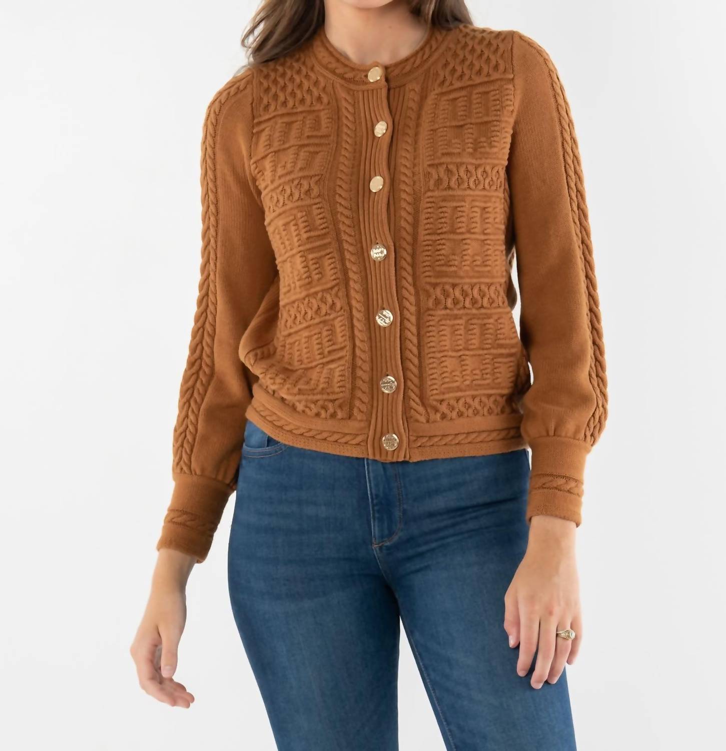 A classic fit that works just as good buttoned as it does left open. The Chloe Cardigan in Brown Sugar is a timeless knit reimagined with signature details. Designed with a crew neckline and a gold logo button front, this piece highlights intricate cable knitting interwoven with our signature logo motif across the body and sleeves. Braided trim accents the cuffs and hem, adding depth to the texture. Subtle volume at the sleeves provides a modern touch, while the tailored length makes it versatile for layering. A rich, warm tone completes this cardigan, making it an instant wardrobe staple. Details: Gold button front closure Subtle blouson sleeves Tapered wrist cuffs 95% Cotton / 5% Cashmere Hand wash with gentle liquid or powder detergent. Cold water will help preserve color & shape. Hang dry.
