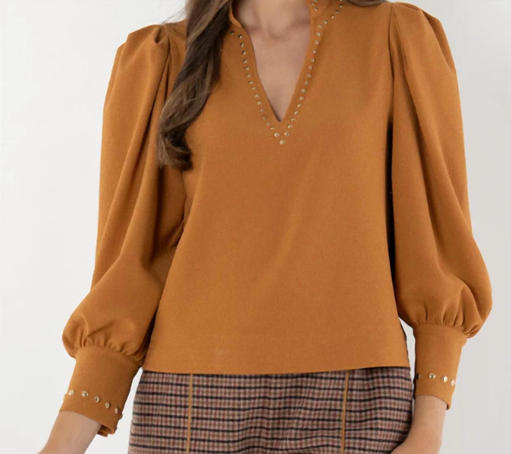 A timeless blouse that will never go out of style. Introducing the Hampton Top by Emily McCarthy, a sophisticated blouse in warm Brown Sugar, perfect for transitional seasons. The long blouson sleeves and V-neckline are complemented by elegant gold stud detailing, adding a chic touch to your ensemble. Composition: 98% Polyester, 2% Spandex with a 100% Polyester lining, featuring a pull-on closure. Care: Delicate cycle wash with gentle liquid or powder detergent, cold water recommended to preserve color and shape, hang dry.