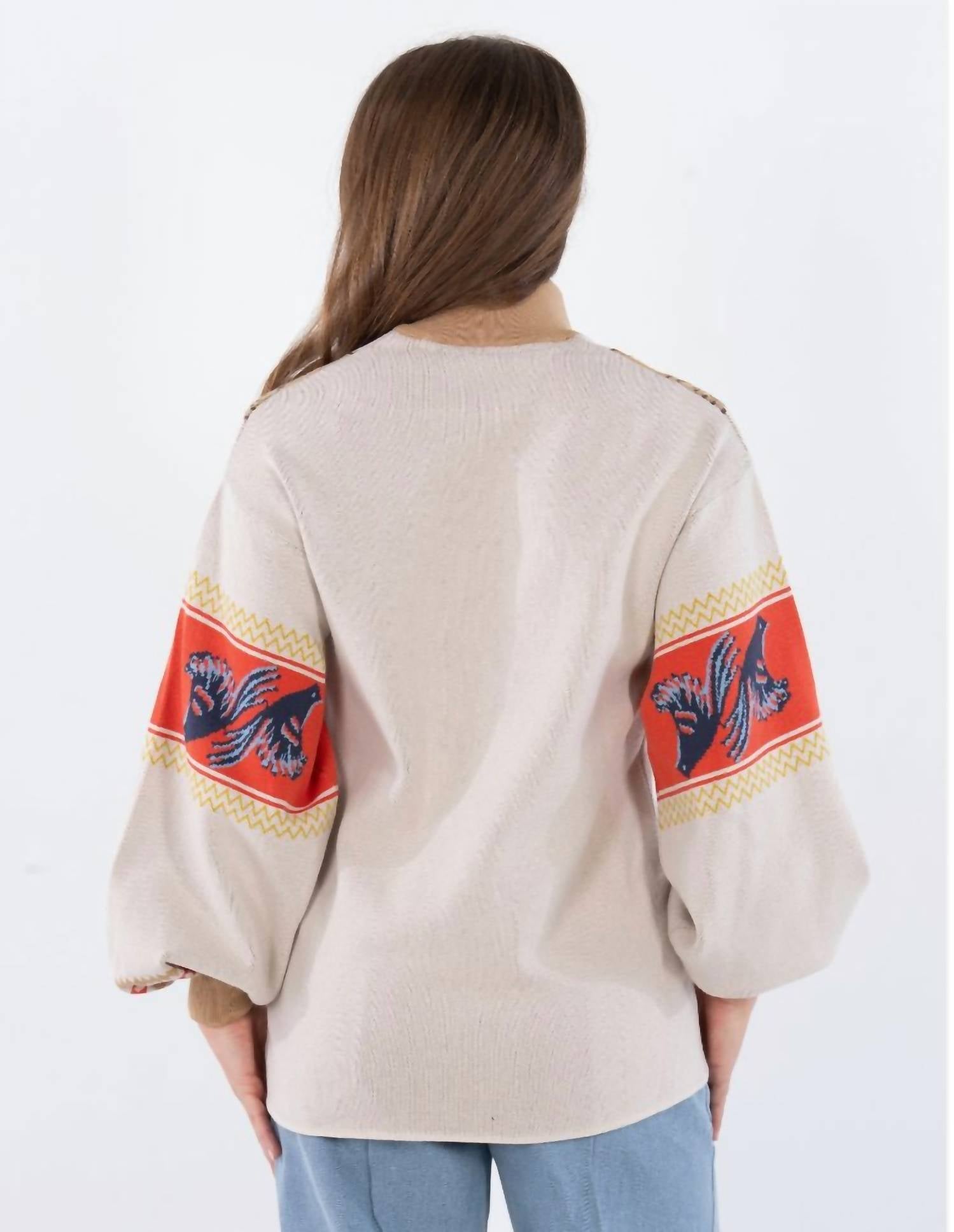 A timeless v-neck sweater that works season after season. Introducing the Emily McCarthy Lolli Long Sleeve Sweater in Lone Star, a chic and cozy addition to your wardrobe for Fall. This statement piece with its classic stand collar and notched neckline is brought to life with blouson sleeves featuring bold patterned bands for added flair. Crafted from a soft 72% Viscose, 28% Polyester blend, this sweater ensures a slightly tailored silhouette for an effortless fit. Closure: Pull-on. Care: Hand wash and lay flat to dry.