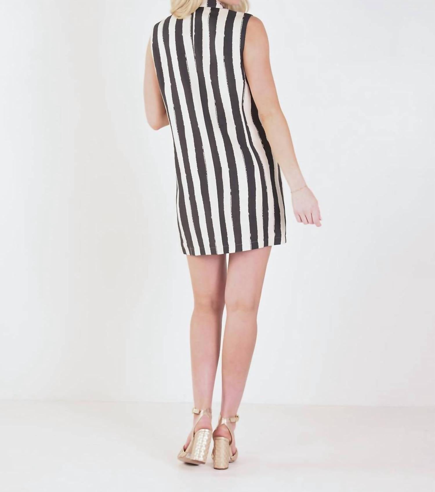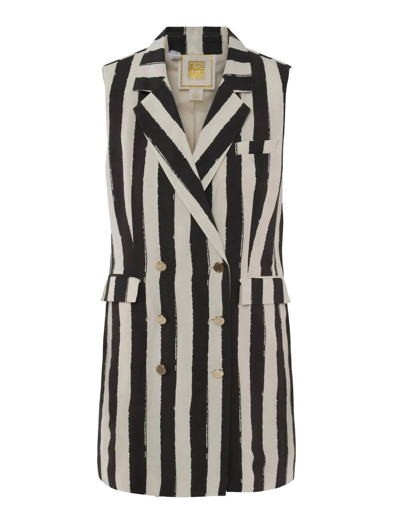 The kind of easy and flattering dress you'll be reaching for all season long. Discover effortless elegance with the Veronica Dress by Emily McCarthy, perfect for a summer evening event. This sleeveless mini dress in Stripe Noir features a classic lapel collar and a shift silhouette, enhancing its tailored fit. Made from 70% Rayon and 30% Linen, it boasts a double-breasted button closure for a structured look. Care: Dry clean only and spot clean with cold water using a white cloth. Model Emma is 5'10" and wears size XS.