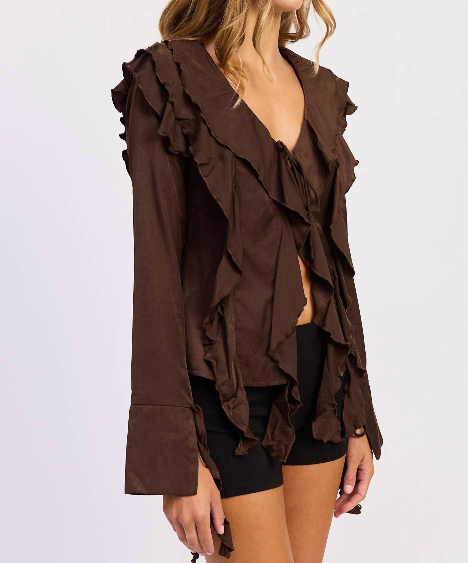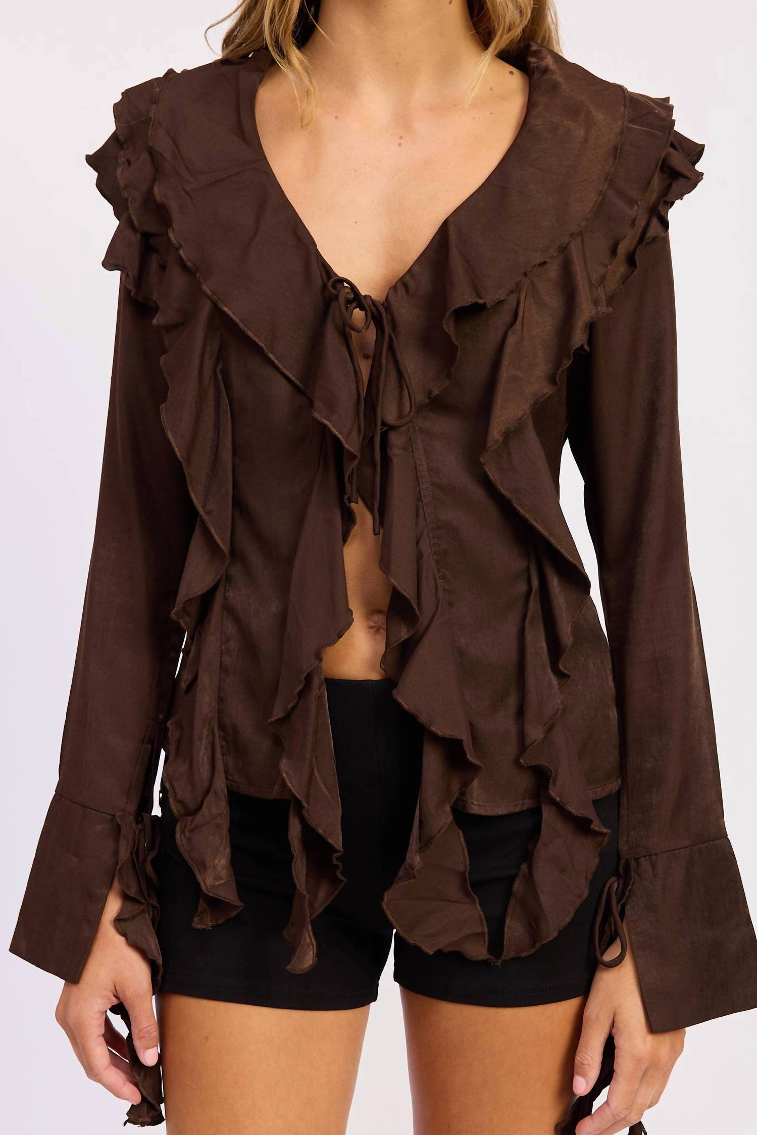 Pair this with your favorite jeans and slides for your next girls night out. Introducing the Front Tie Ruffled V-neck Top by Emory Park, a perfect choice for a boho-chic look at your next cocktail party. This chocolate-colored blouse features long sleeves and a romantic flowy silhouette, complete with a delicate ruffle trim. Crafted from a blend of 61% Rayon and 39% Polyester, it boasts a solid pattern and an elegant V-neck. Designed with a pull-on closure, this top requires hand wash care.