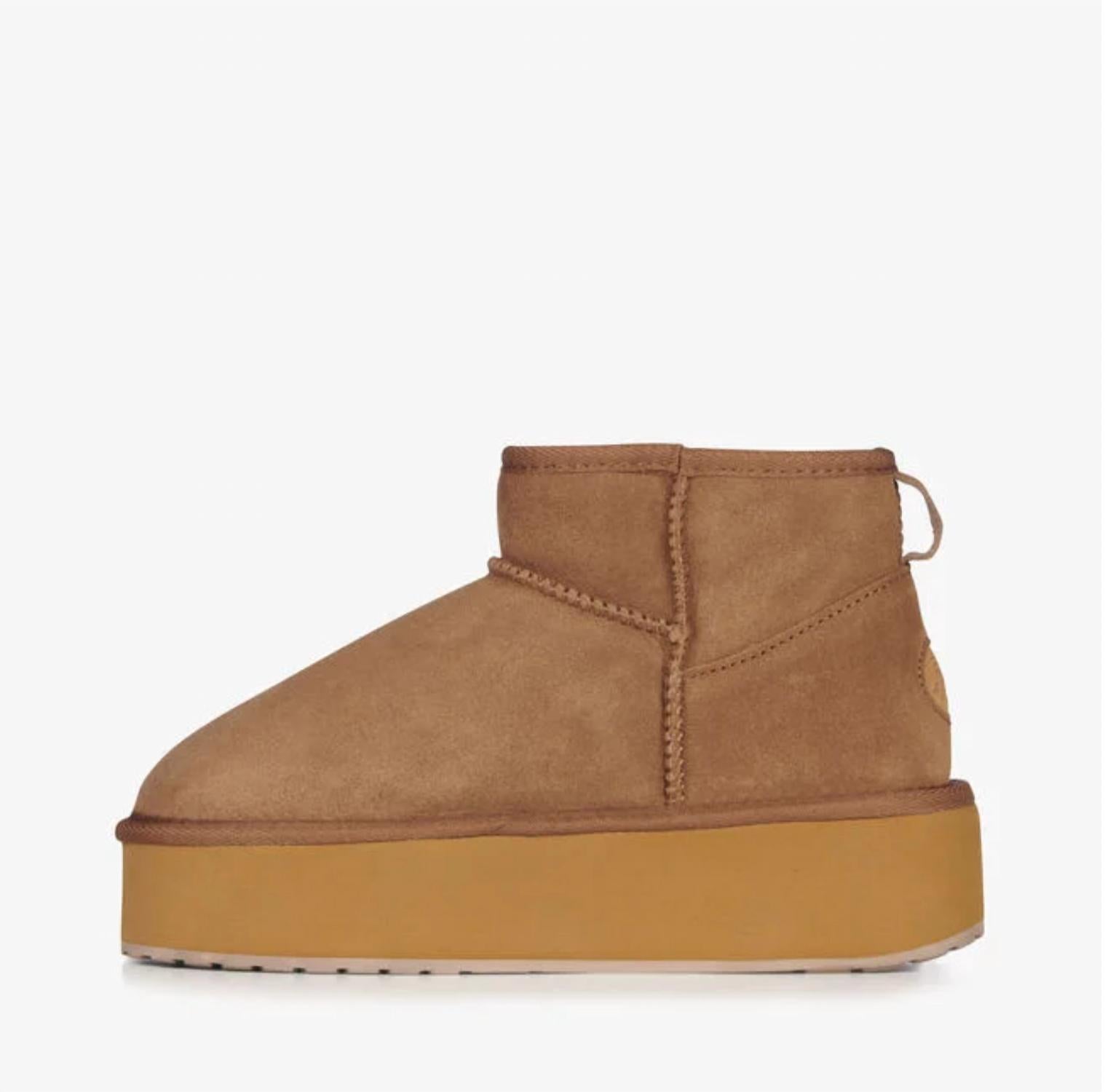 Say hello to the perfect, most versatile boot. The ankle height makes this style easily transition from day to night. Wear them with your favorite skinny jeans and tee for a more laid back look, or pair them with your favorite mini dress and jacket for a night out on the town. Emu Australia Women's Stinger Micro Flatform W13082 Chestnut. Introducing the Stinger Micro Flatform by EMU Australia! These water-resistant sheepskin boots combine street style with a 5cm platform heel for a modern twist on the classic design. The cozy and soft interior will keep you comfortable all day, while the reliable traction makes them ideal for any adventure.