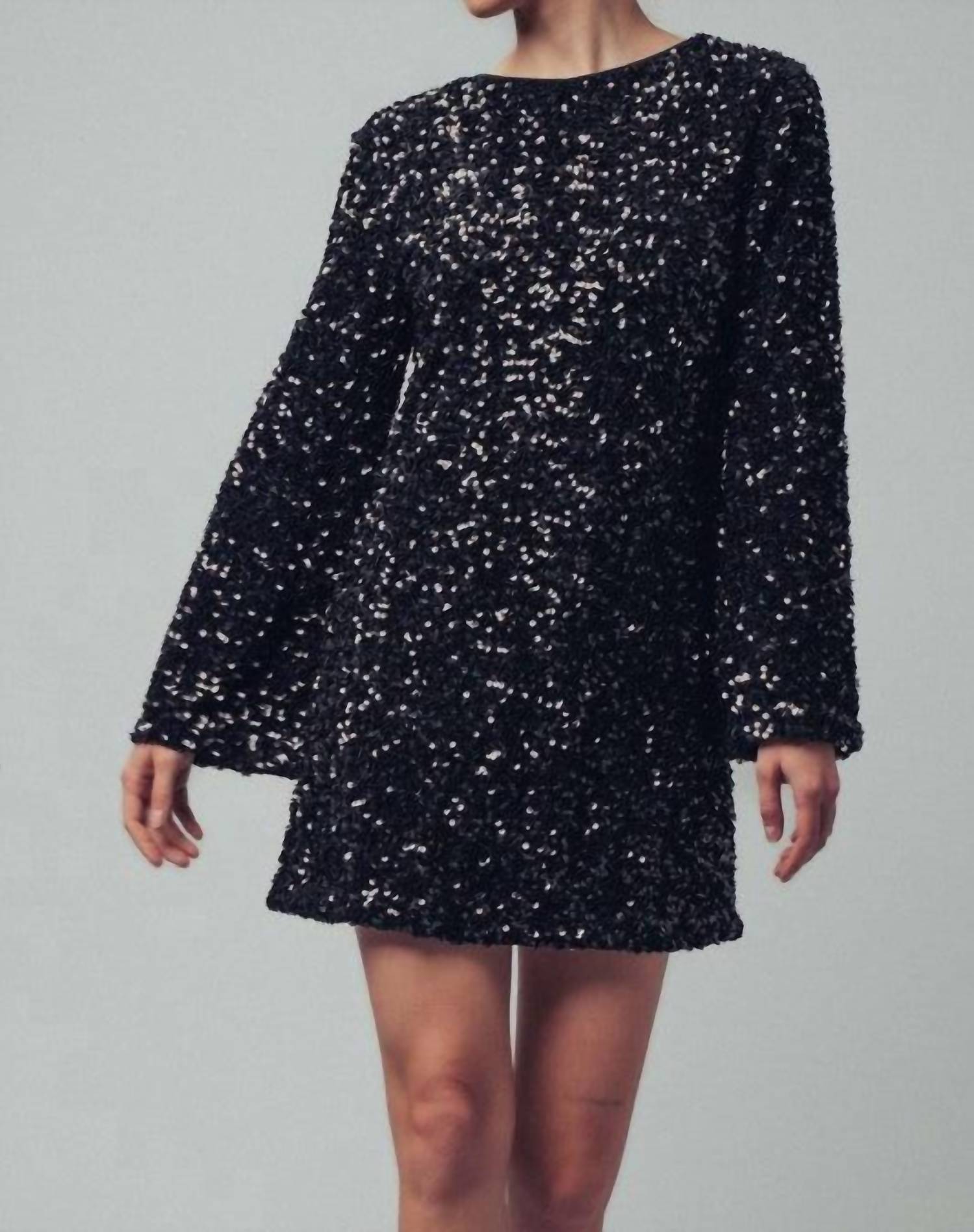 The kind of easy and flattering dress you'll be reaching for all season long. The Evangeline Sequin Mini Dress by EN CREME is your ultimate statement piece for any glamorous occasion. This sophisticated long-sleeve mini dress, drenched in black sequins, ensures you'll shine with every move. Crafted from 95% Polyester and 5% Spandex with a 100% Polyester lining, its tie-back closure and delicate back-tie bow add a feminine flair. Care: Machine wash according to instructions on care label, line dry.