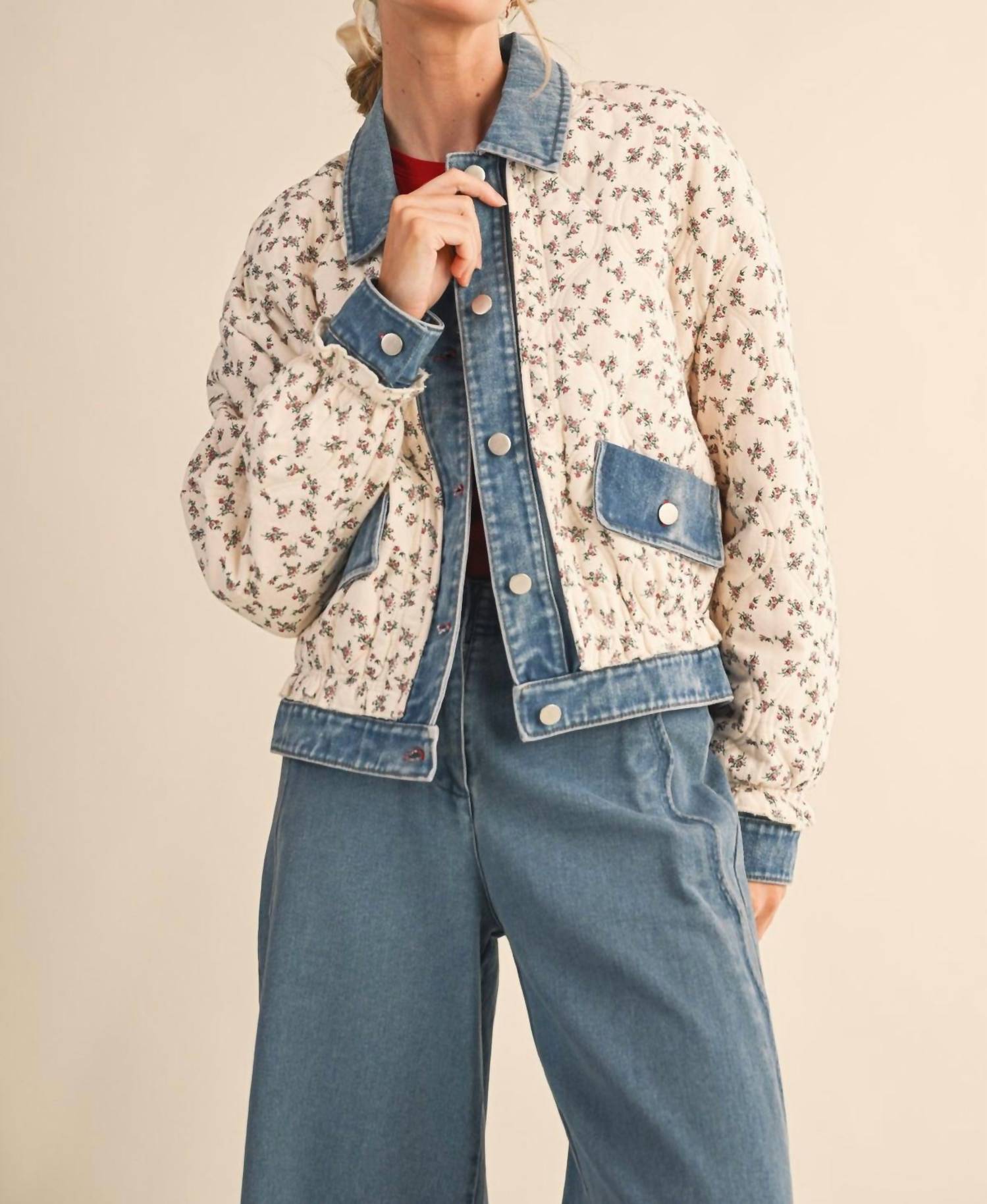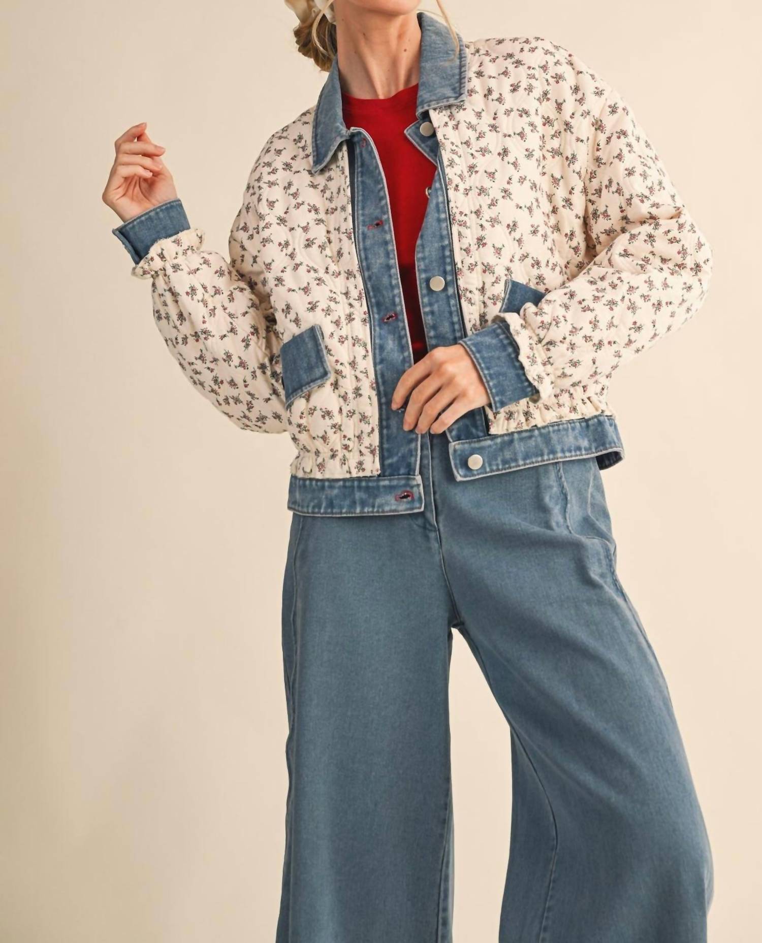 Throw this adorable jacket over just about anything for an effortlessly stylish look. Presenting the Lila Quilted Floral Denim Jacket by En Merci, designed for a striking vacation style with a 90s fashion trend. Crafted with a quilted floral body accented by denim contrast details, this piece features long puff sleeves and a drop shoulder design. Material: 100% Cotton. Closure: Button closure. Care: Machine wash, tumble dry. Enjoy the additional flair of a ruffled elastic waistband and practical denim buttoned cuffs with patch pockets. Lined for enhanced comfort and structure, this jacket showcases a collared neckline with a denim button placket.