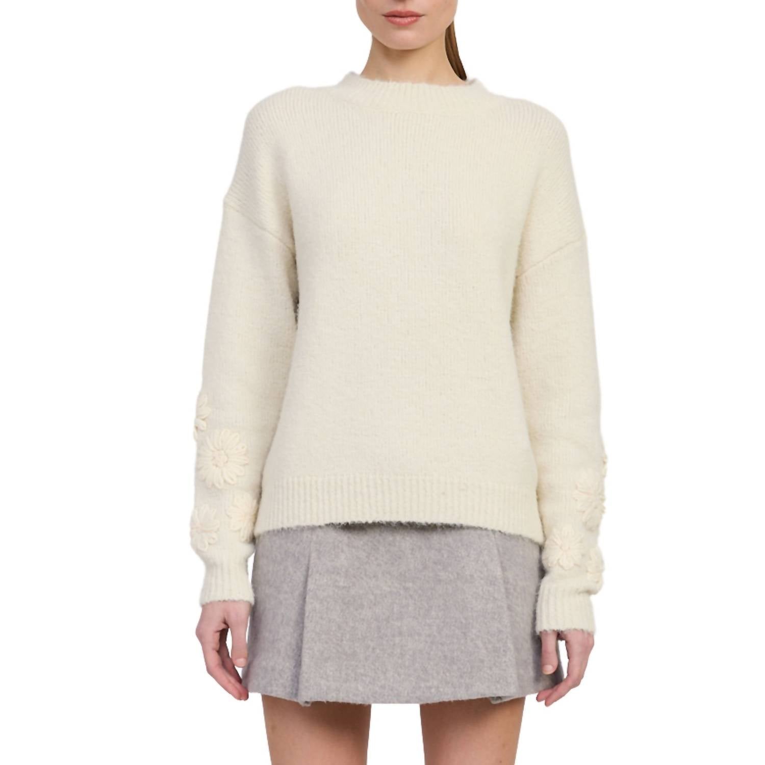Experience the perfect blend of comfort and style with this trendy crew neck sweater, designed to effortlessly elevate your wardrobe. Pair it with your favorite denim and loafers for the perfect look. Introducing the Alannah Knitted Sweater by En Saison, a cozy and chic addition to your collection. This ivory piece features long sleeves adorned with delicate floral appliqués, adding a feminine touch to its relaxed silhouette. Crafted from a nylon blend, this solid sweater offers effortless comfort with a crewneck design and ribbed trims. Closure: Pull on. Care: Machine wash. Perfect for transitioning from casual days to polished evenings, it's ideal for pairing with skirts, denim, or tailored pants.