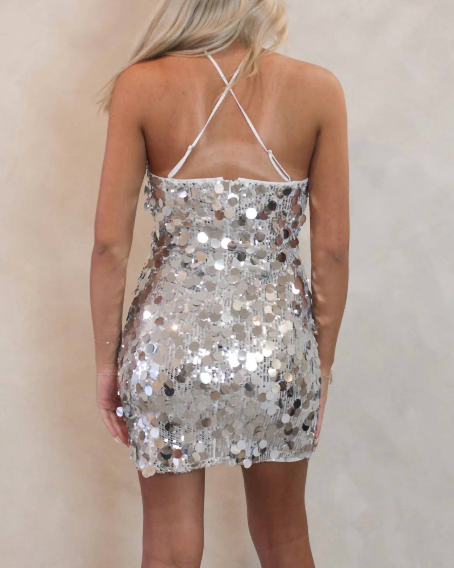 The perfect mini dress for those warmer months. Step out in style with the Disco Diva Sequin Dress by ENDLESS BLU, guaranteed to make you the center of attention at any holiday party. This silver mini dress features spaghetti straps that criss cross at the back and an eye-catching allover sequin design for a textured and sparkling look. Made from 100% polyester, it showcases a flattering fitted silhouette, while ensuring comfort with a lined interior. Closure: Hidden back zip. Care: Hand wash and line dry to keep your dress sparkling for every occasion.