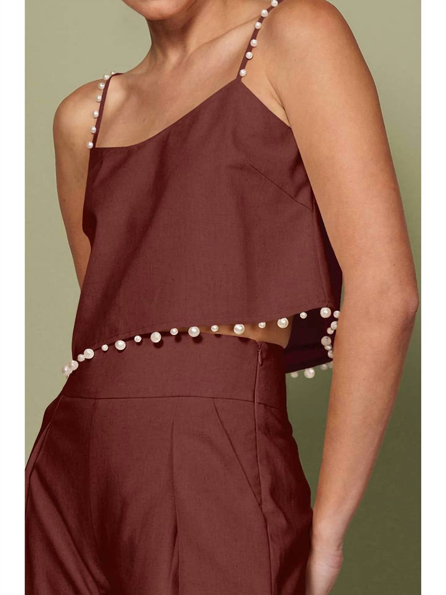 The perfect crop top for those warmer weather days. Elevate your summer wardrobe with the Pearl Trimmed Linen Blend Crop Top by ENDLESS BLU, an essential piece for any dinner party. This sleeveless, solid rust-colored top is crafted from breathable linen, offering a perfect blend of comfort and style. Designed with a chic scoop neckline and a convenient pull-on closure.