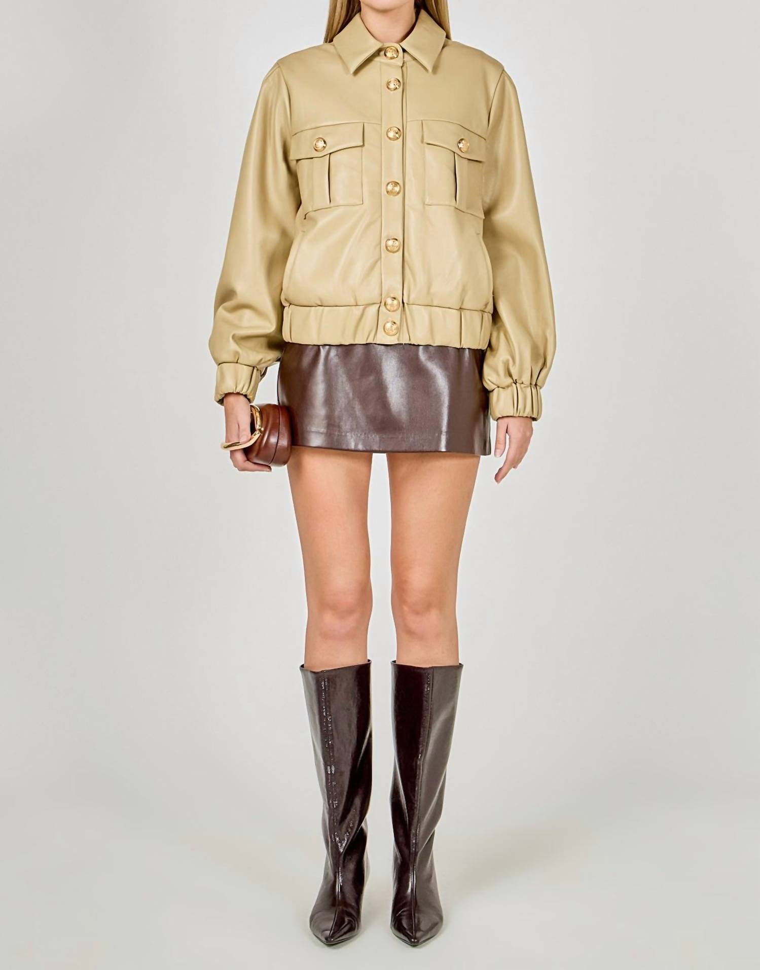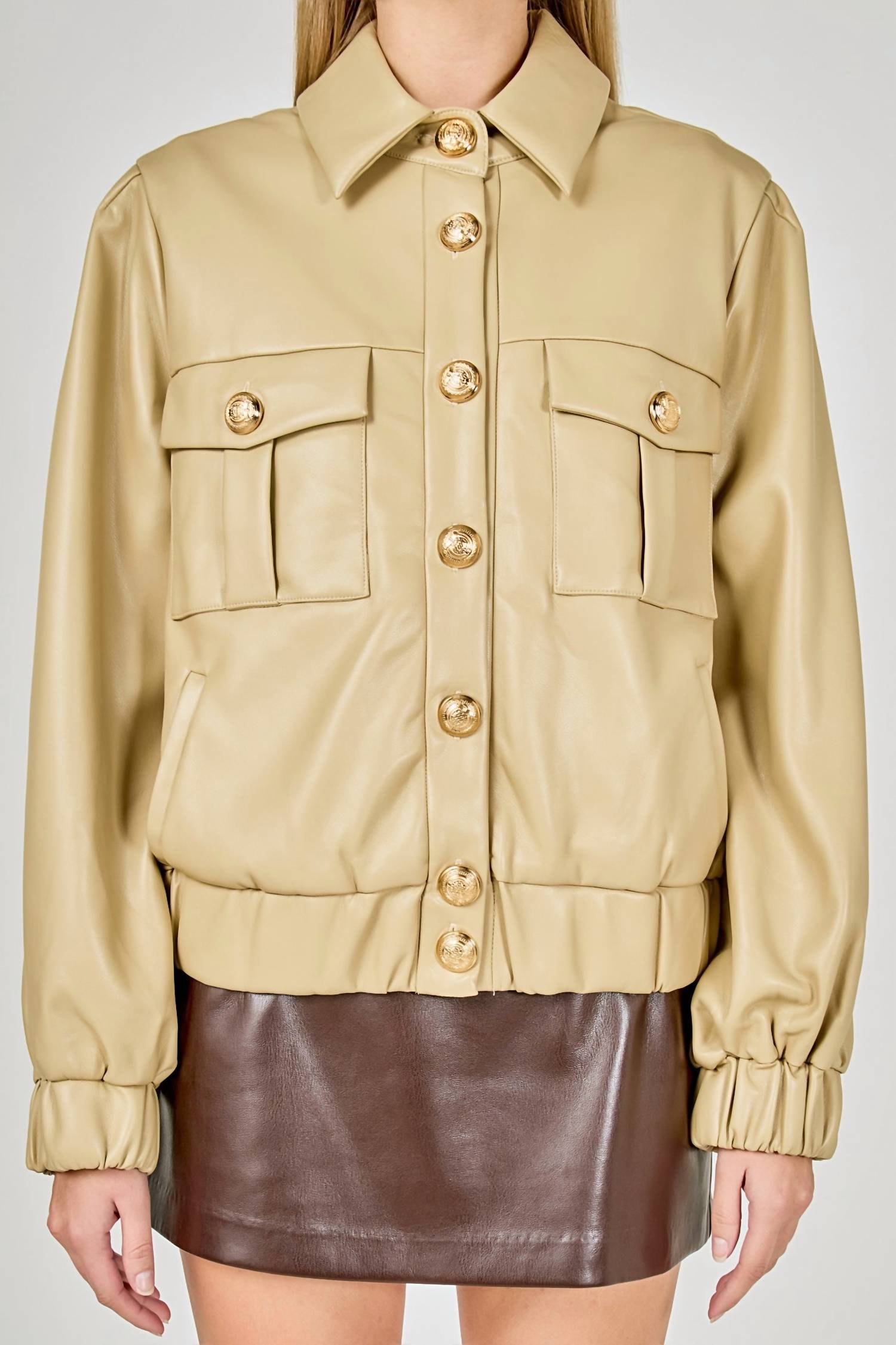 A leather jacket so good, it works with just about any outfit. The Faux Leather Buttons Jacket by endless rose is a chic addition to any fall wardrobe. This women's jacket features long sleeves and is crafted from luxuriously soft faux leather composed of 50% Polyester and 50% Polyurethane, with a 100% Polyester lining. Designed with a 23.50" total length and a 39" bust, it showcases a collar and a center-front button closure accentuated by stylish gold buttons. This minimalist beige piece offers practicality with chest flap patch pockets that have button closures along with lined slant pockets, and it's easy to maintain with hand wash care instructions. Model is 5'10" with a bust of 34", wearing size S.