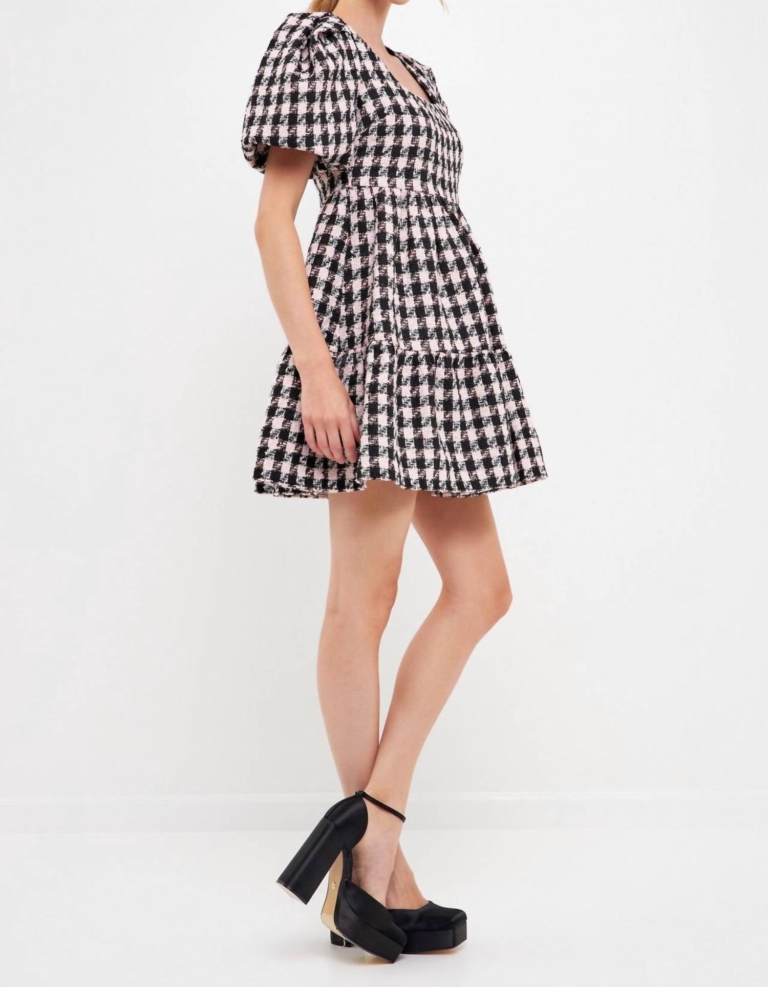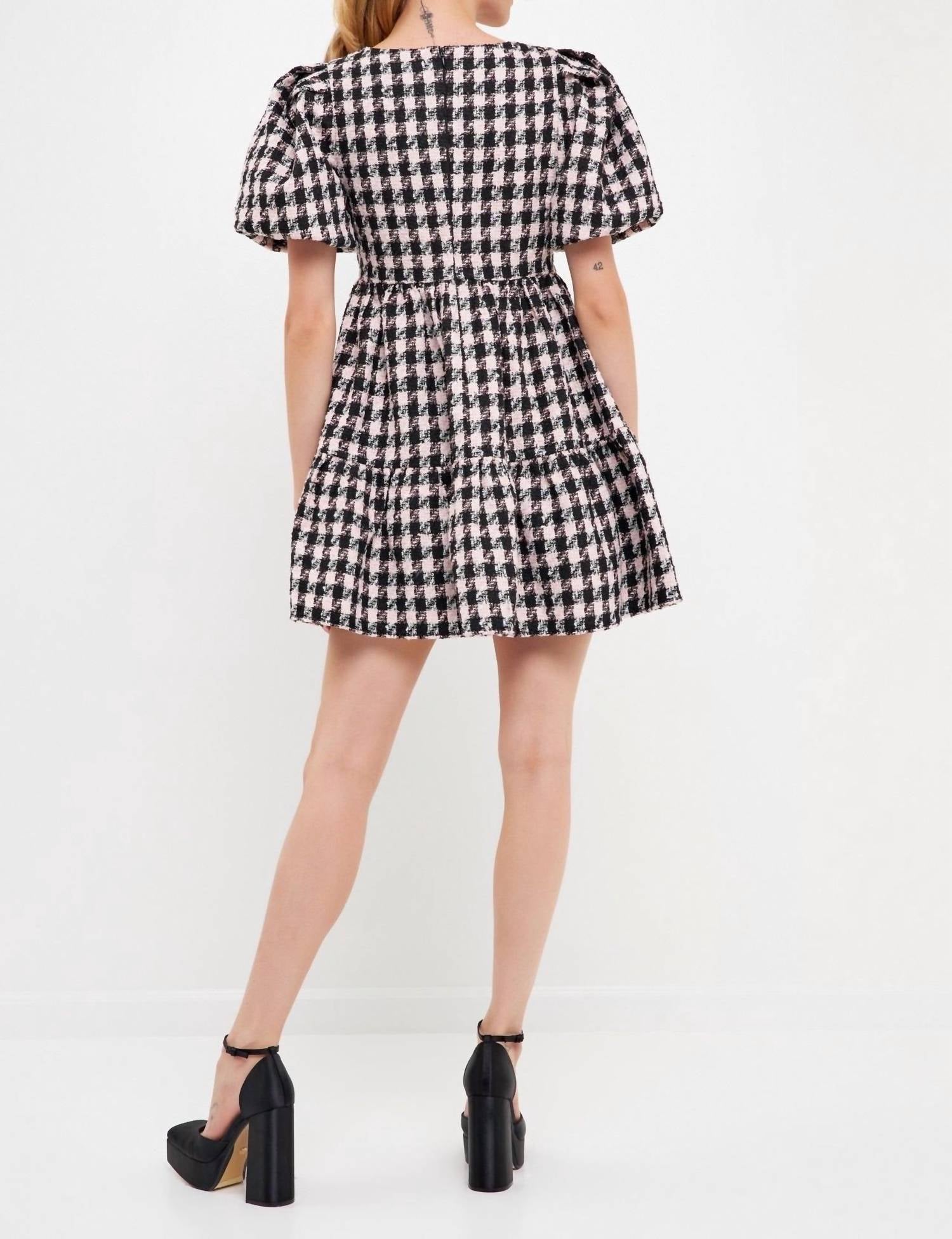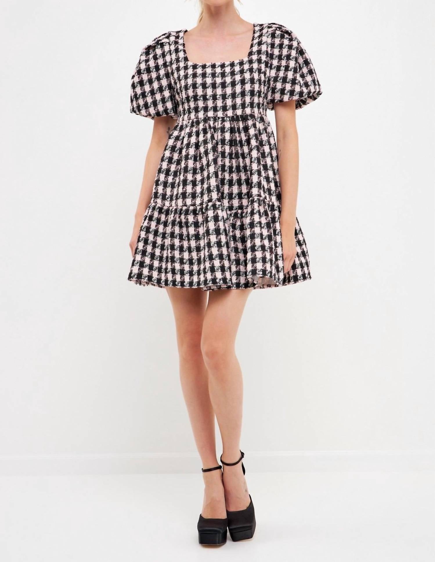 The perfect mini dress for those warmer months. Introducing the Genevieve Tweed Puff Sleeve Mini Dress by English Factory, your go-to for any special occasion this holiday season. This women's short sleeve dress features a playful squareneck and an A-line silhouette, crafted from plaid and check tweed in a striking pale pink and black. Made for eye-catching appeal, the dress is complete with a zip closure and falls to a mini length. Care is simple: hand wash and lay flat to dry.