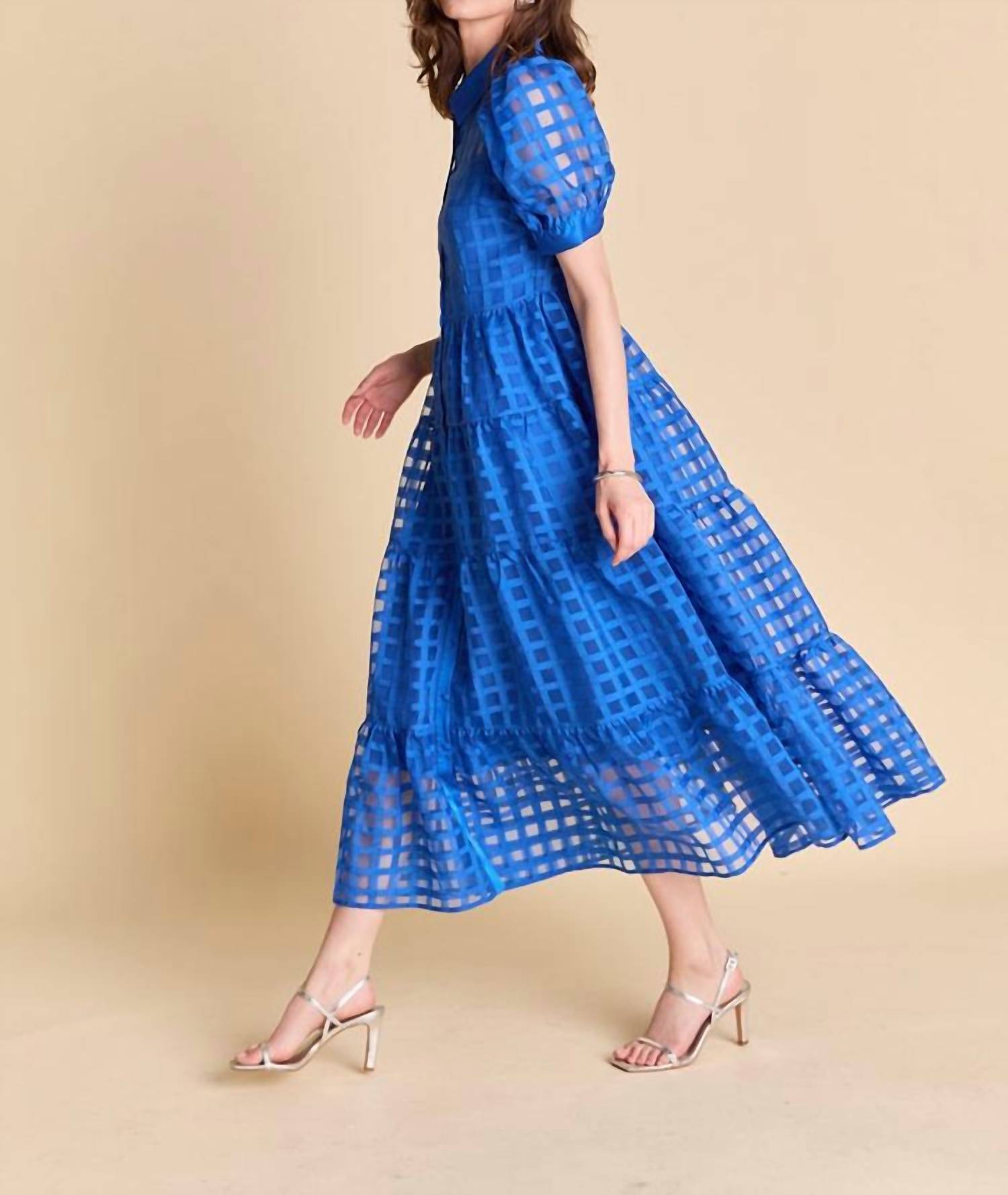 Who doesn't love a good maxi dress? This one you'll be reaching for season after season. Elevate your holiday party look with the Gridded Organza Tiered Maxi Dress by English Factory, a perfect choice for a Thanksgiving get-together. This cobalt dress features short sleeves and a stylish collar for a classic touch, and it's crafted from textured polyester in an A-line silhouette for a minimalist vibe. It has a convenient button closure and lacks pockets to maintain its sleek design. Care is simple with hand washing and line drying instructions, ensuring you can keep this stunning piece in pristine condition.
