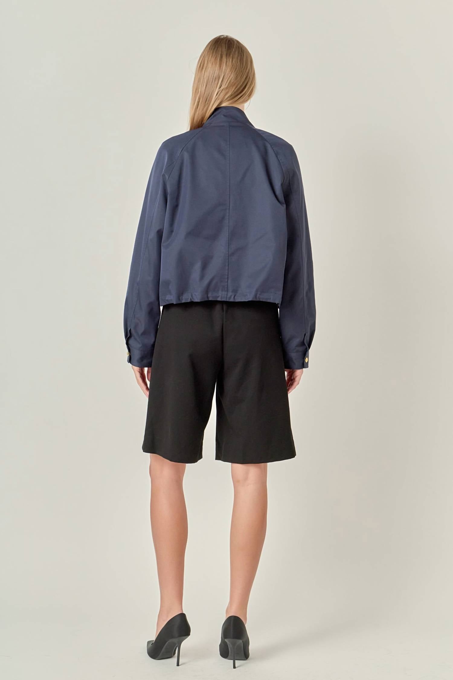 Make any outfit instantly cool by pairing it with this bomber jacket. Introducing the Lightweight Bomber Jacket by English Factory in a chic navy hue, perfect for summer travels. This women's bomber jacket features long sleeves and a standing collar for enhanced style, made with a durable 100% nylon shell and lined with 100% polyester for comfort. Its practical design includes elastic cuffs, front snap closure with a hidden zip, and flap welt pockets. For care, hand wash cold, iron low, and do not tumble dry to preserve the fabric's integrity.