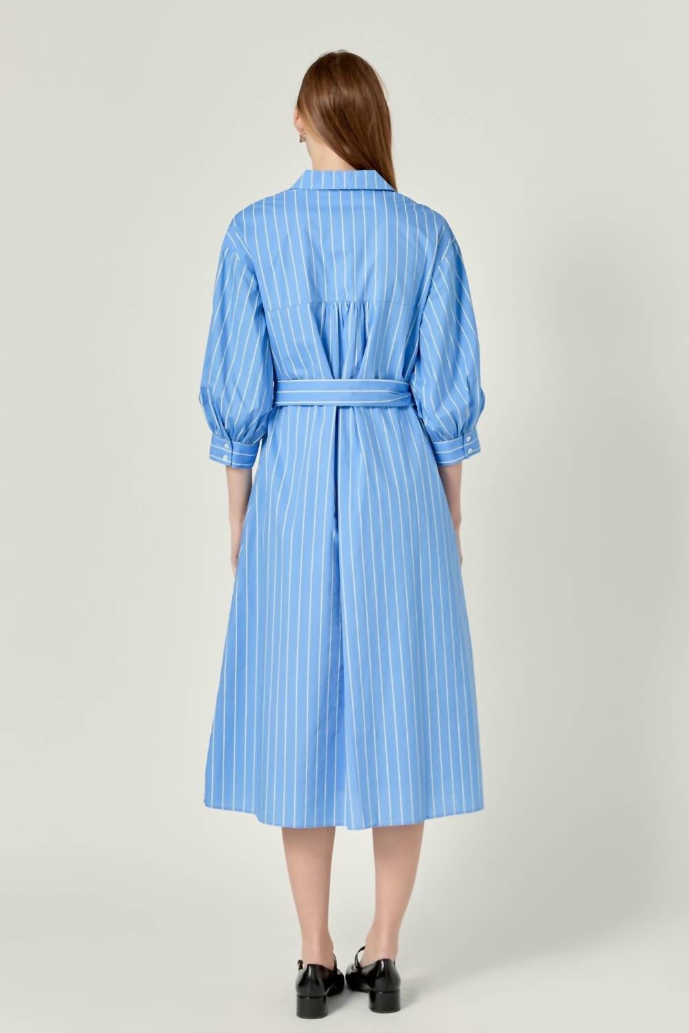 Just add slides or mules and you are good to go. The Logan Shirt Dress by English Factory is a stylish women's piece that combines classic stripes in blue and yellow with a modern twist. Featuring three-quarter sleeves, a comfortable pull-on closure, a collar neckline, and handy pockets, this midi dress provides a chic option for church or any elegant outing. Garment Length: Midi. Care for this dress by hand washing it to maintain its vibrant design and structure.