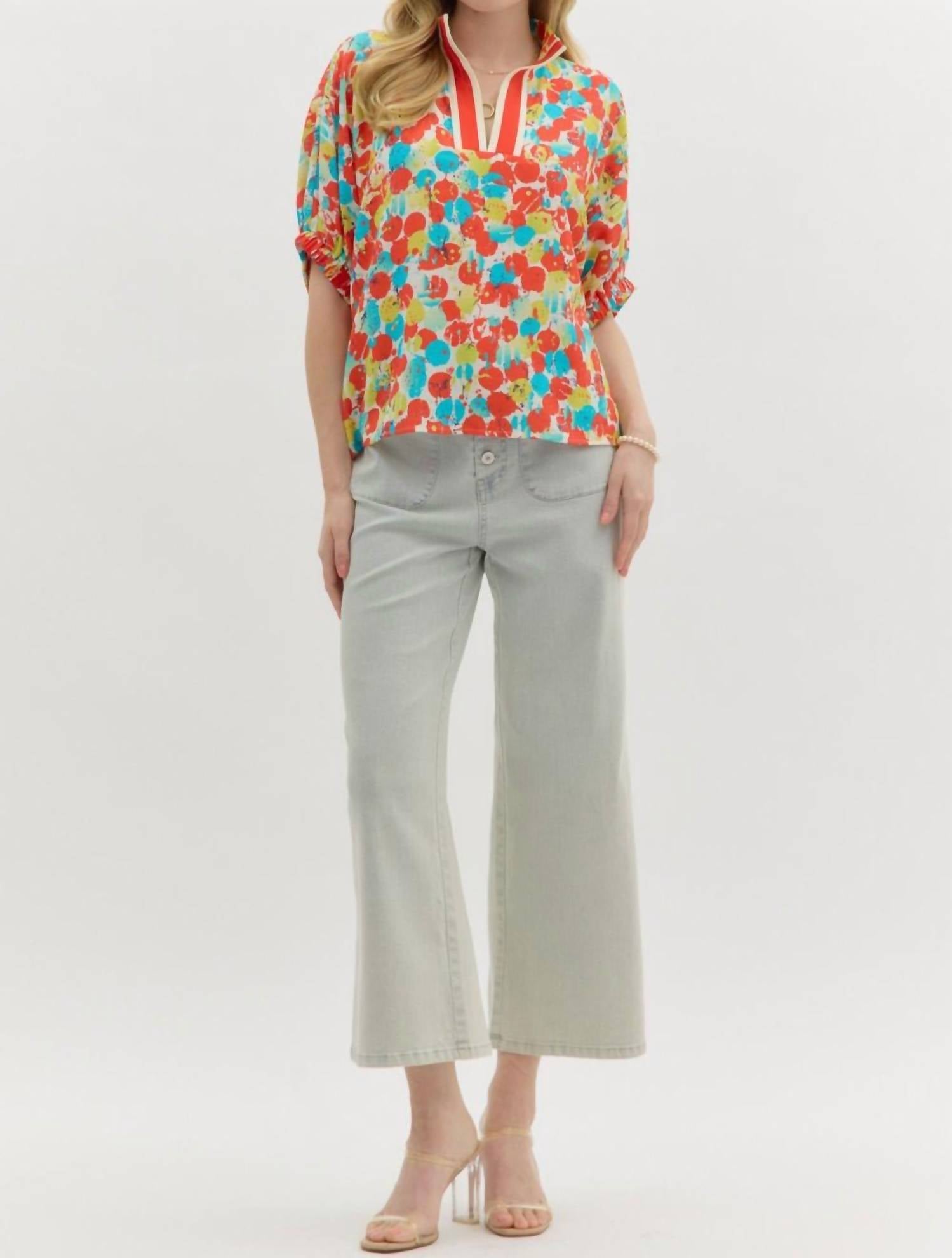 A timeless blouse that will never go out of style. Presenting the Abstract Print Dolman Sleeve Pullover Top by entro, perfect for a striking entrance with its vibrant multicolor abstract pattern. This blouse features short elasticated sleeves and a fashionable split high neck band for added flair. It's a lightweight, woven design with a non-sheer finish, and a practical pull-on closure enhances convenience. Available in bust sizes small (50"), medium (52"), and large (54"), with lengths ranging from 23" to 25".