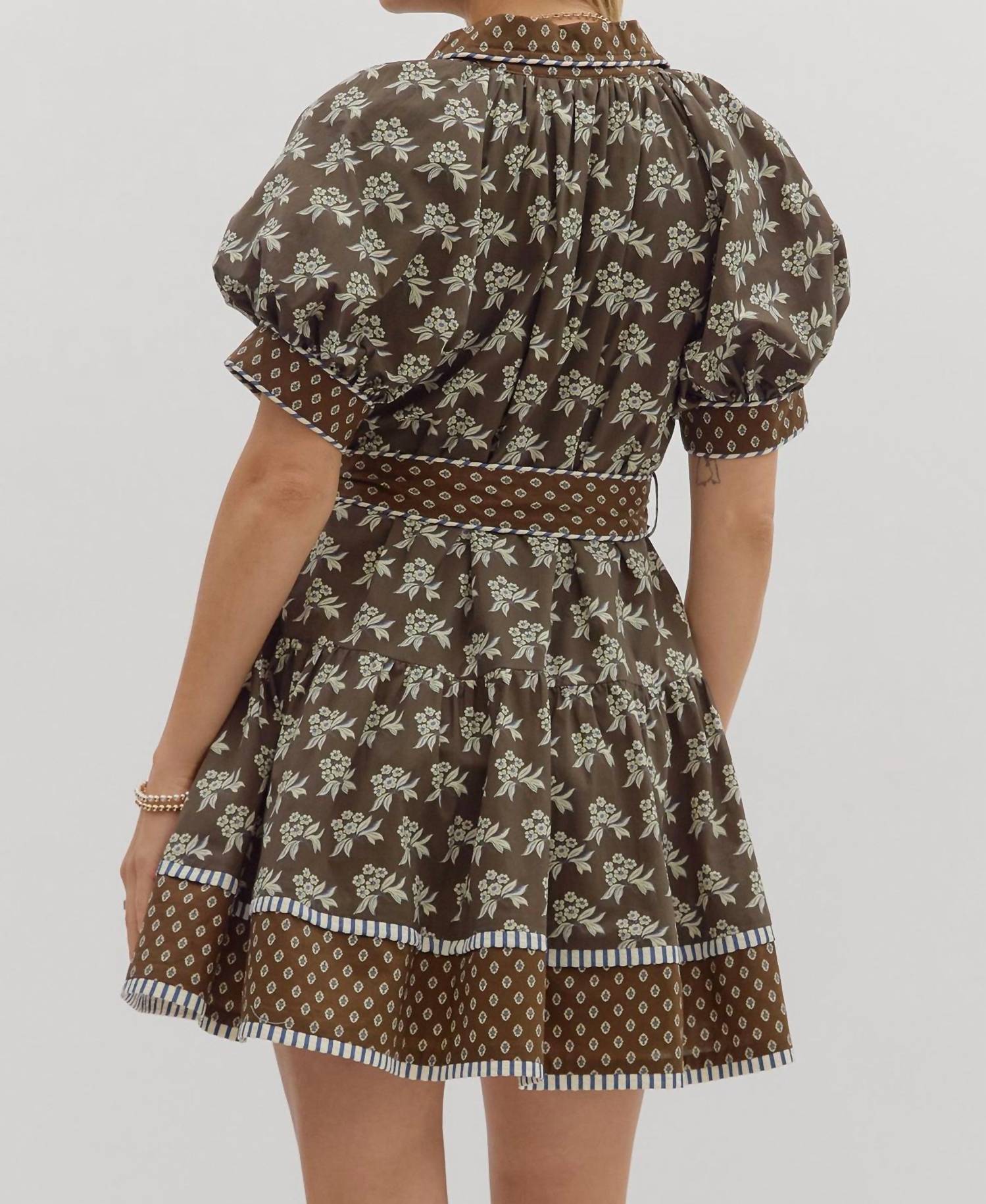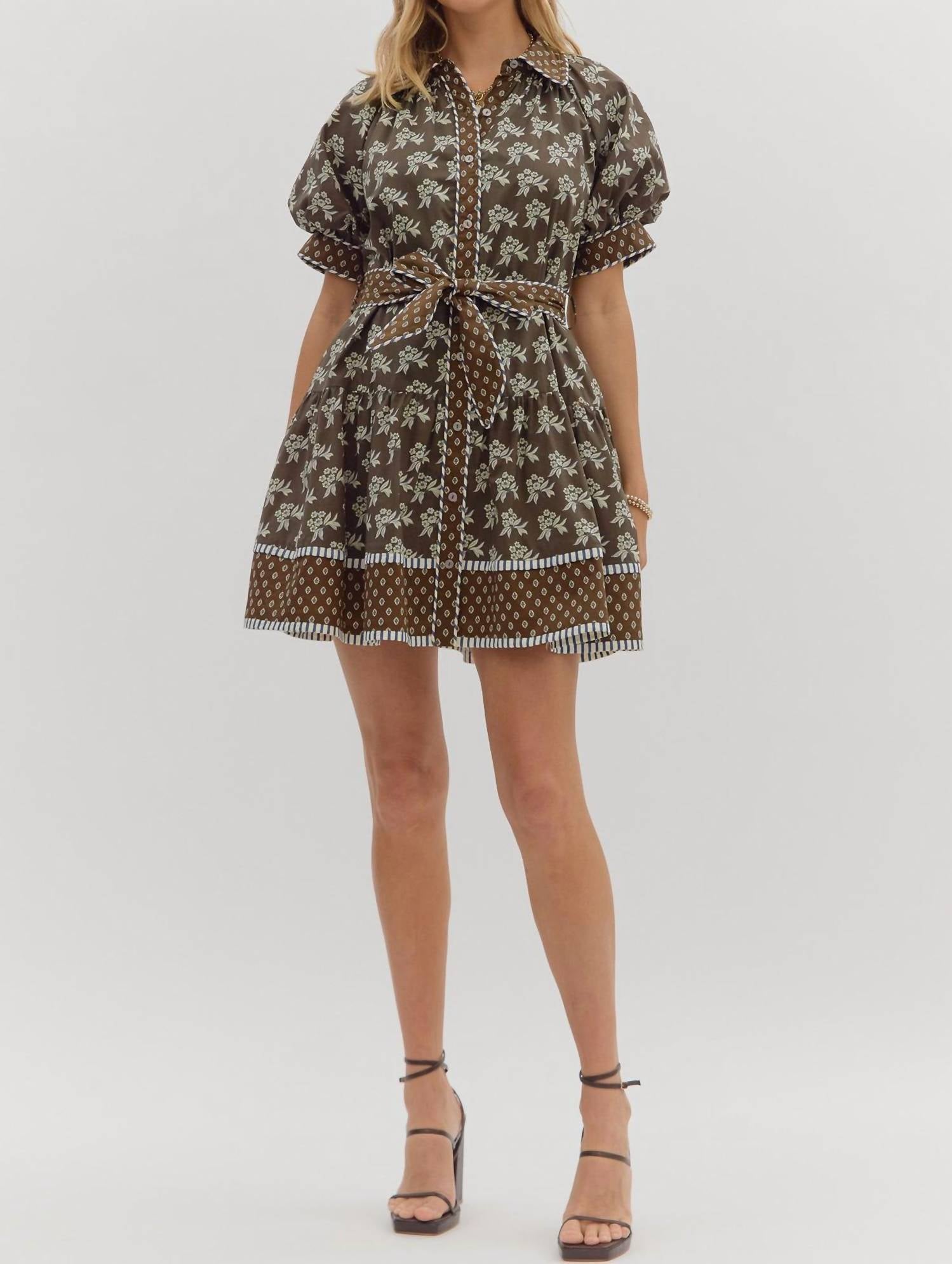 The perfect mini dress for those warmer months. Introducing the Entro Belted Contrast Floral Mini Dress, a chic option for your next dinner party with its minimalist fit and flare silhouette. This elegant piece boasts short bubble sleeves, a sophisticated collar neckline, and a striking floral pattern in brown. Its design includes a button closure and a belted waist for a flattering fit. Ideal for spring occasions, this dress effortlessly combines style and comfort.