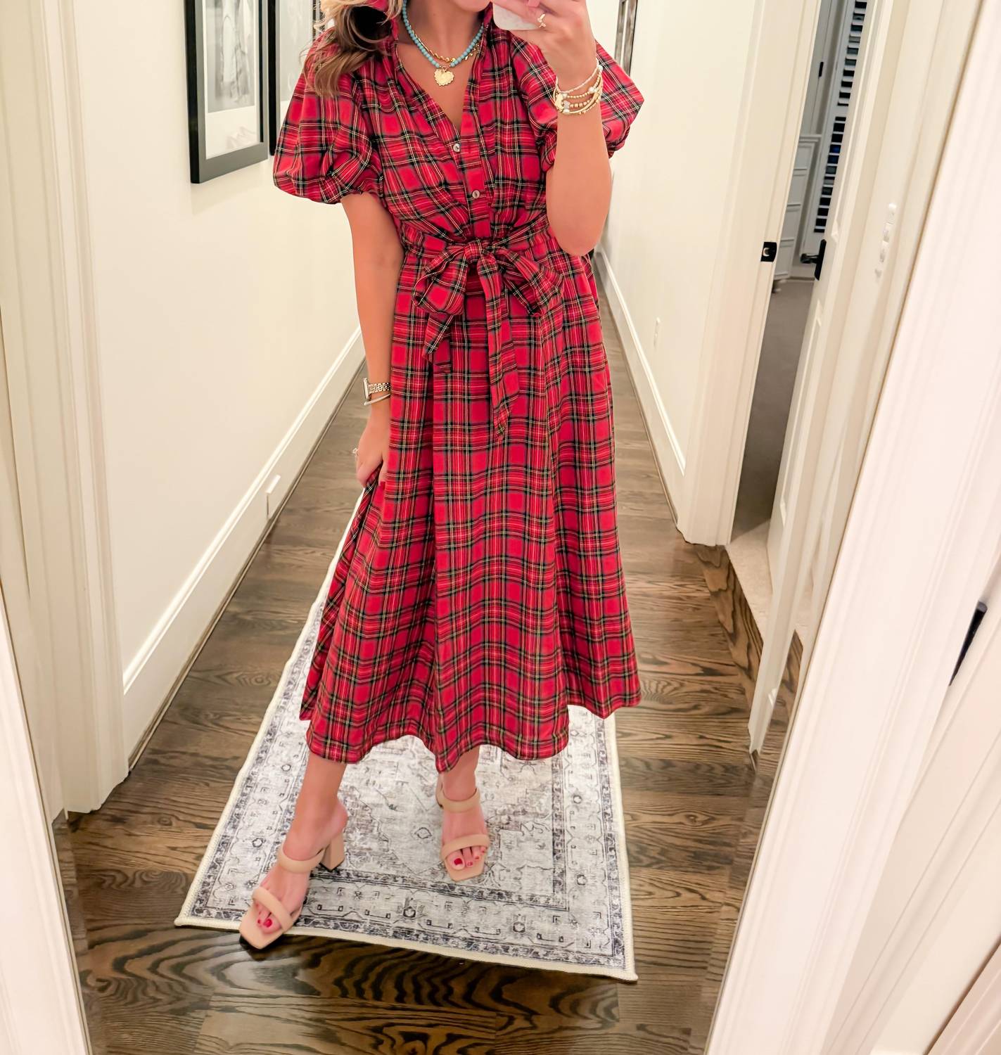 A midi dress so versatile, your options for wearing it are endless. Celebrate the season in style with the Christmas Cheer Midi Dress by Entro, featuring festive plaid in vibrant red perfect for holiday gatherings. This women’s midi dress showcases short puff sleeves, a practical button closure, and convenient side pockets. Material: Cotton. Closure: Button closure. It comes with a self-tie waist belt to accentuate the flattering A-line silhouette, and the lined, woven construction ensures comfort and a polished look for any fall event.