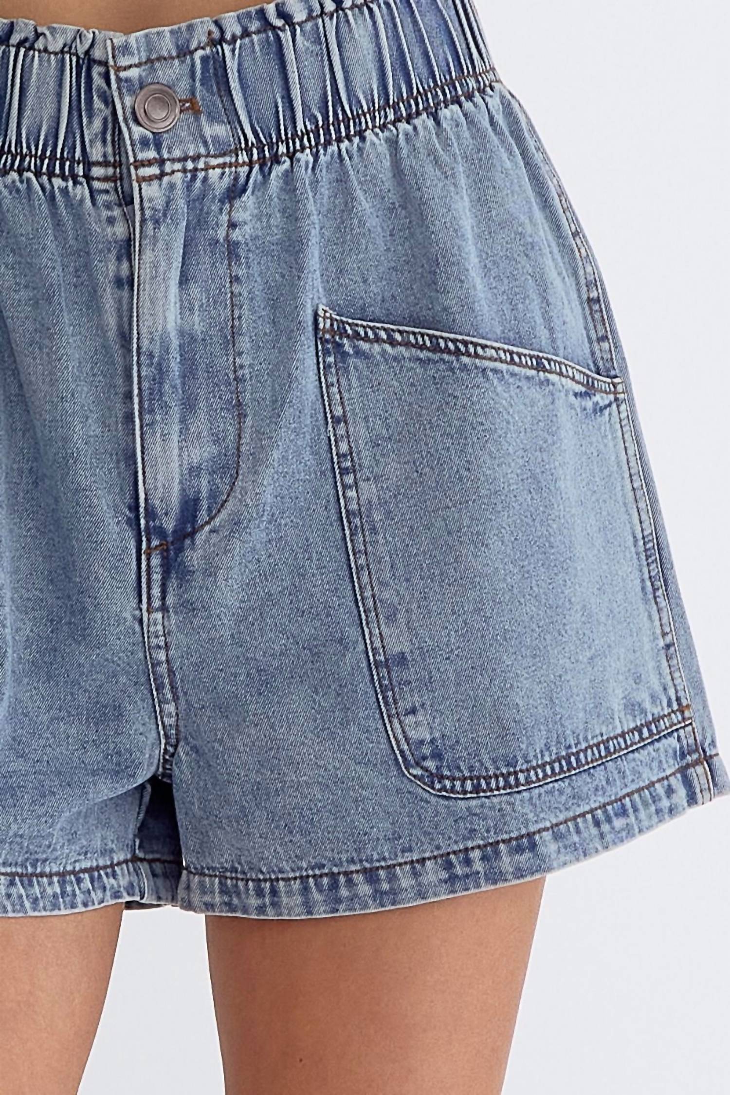 Tuck your favorite tee into these high-waist shorts for a more casual-cool feel. Embrace effortless summer style with the Denim High Waist Shorts by Entro, perfect for your vacation wardrobe. Crafted from lightweight, woven 100% cotton, these denim shorts feature functional pockets at the front and back. They are designed with a flattering high-waisted elasticized waist and a convenient button and zipper closure. Measurements are available with a waist of 26" for small, 28" for medium, and 30" for large; each pair has an inseam of 3".