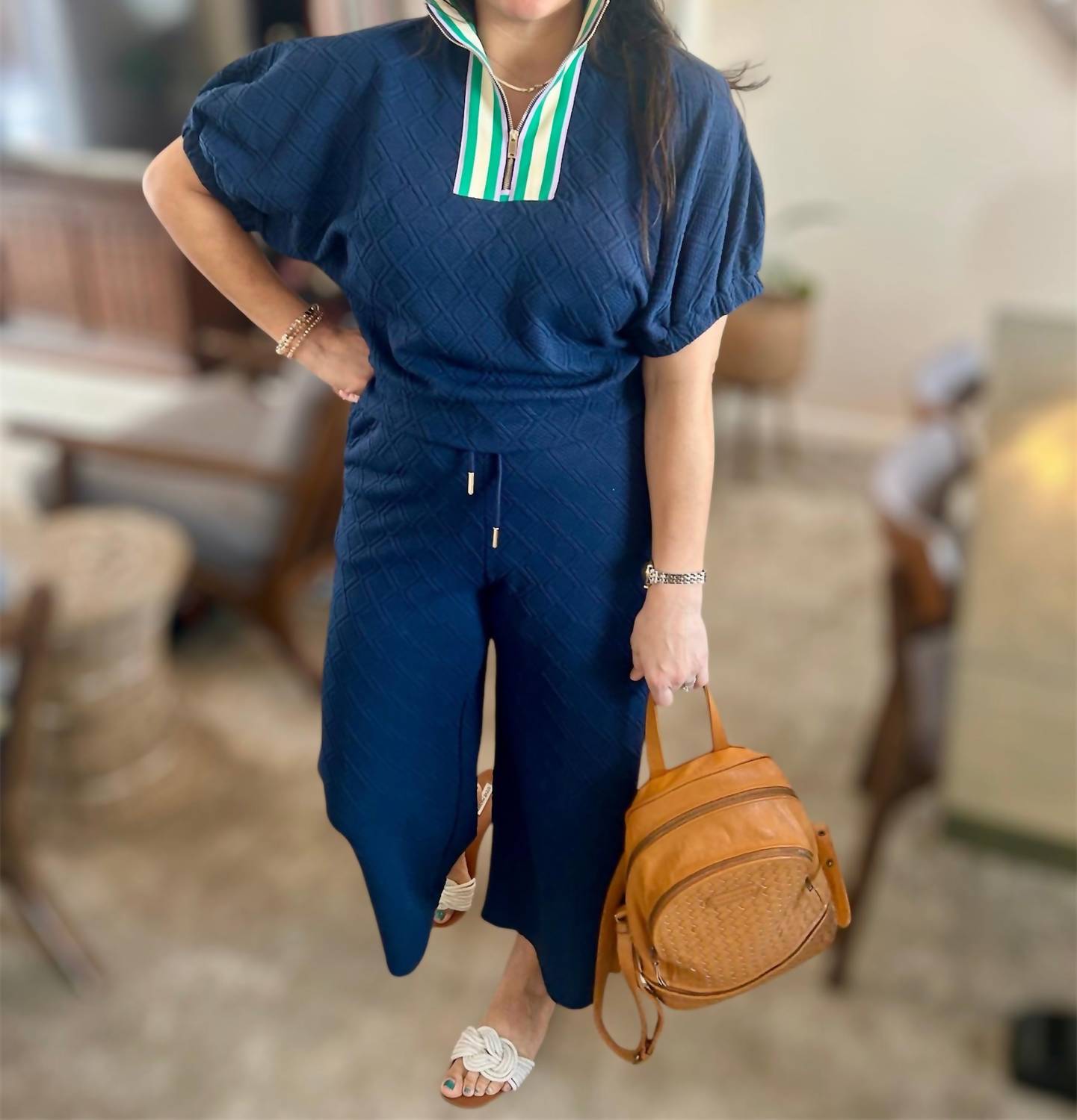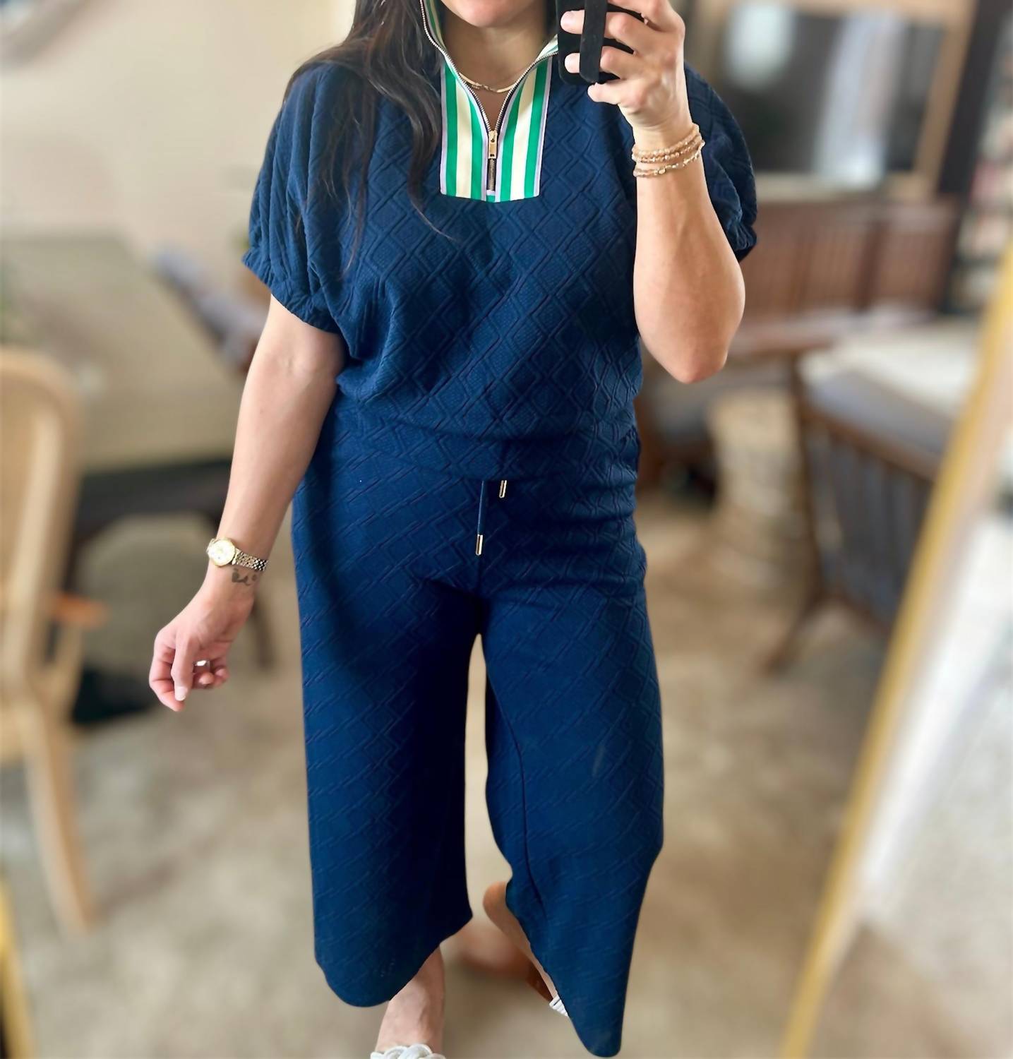 The Diamond Textured Pants by Entro are your go-to choice for vacation-ready style in elegant navy blue. Crafted for women with a mid-rise, regular fit, and wide leg design, these pants feature a textured pattern for added sophistication. Closure: Pull on. Available in sizes with waist measurements of small 24", medium 26", and large 28".
