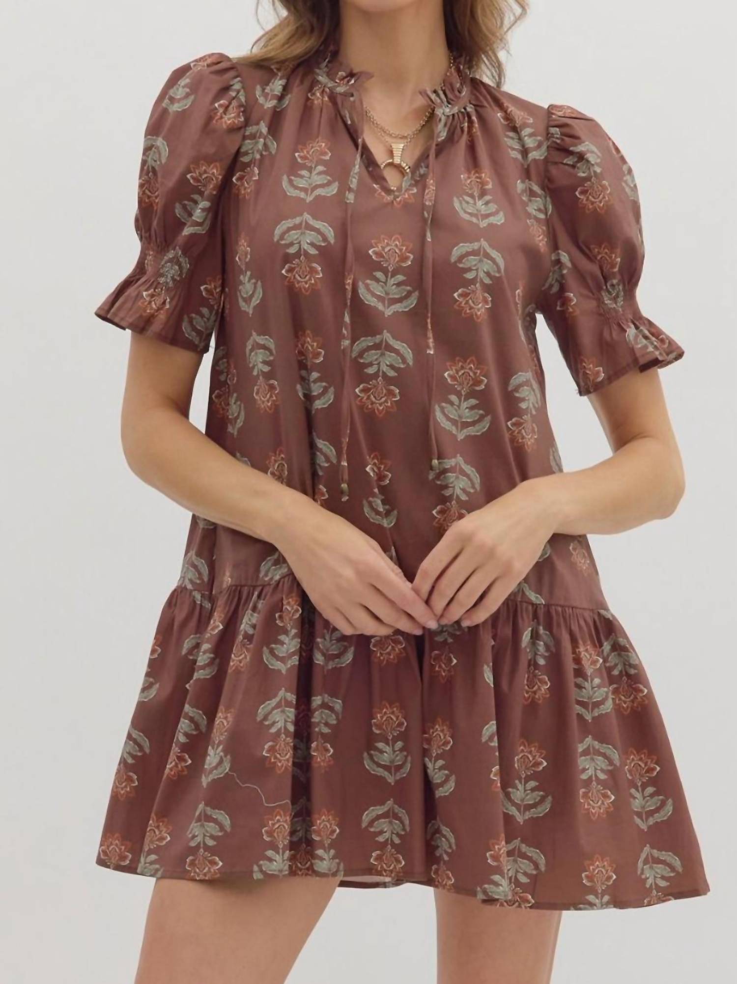 The kind of easy and flattering dress you'll be reaching for all season long. Step into boho chic style with Entro's Floral Smocked Mini Dress in a delightful brown floral print. This A-line mini dress features short puff sleeves and a ruffled edge V-neck with a self-tie detail, perfect for those memorable baby showers or summer holidays. Designed with practicality in mind, the dress includes convenient side pockets and a comfortable pull-on closure. Care: Machine wash for easy maintenance.