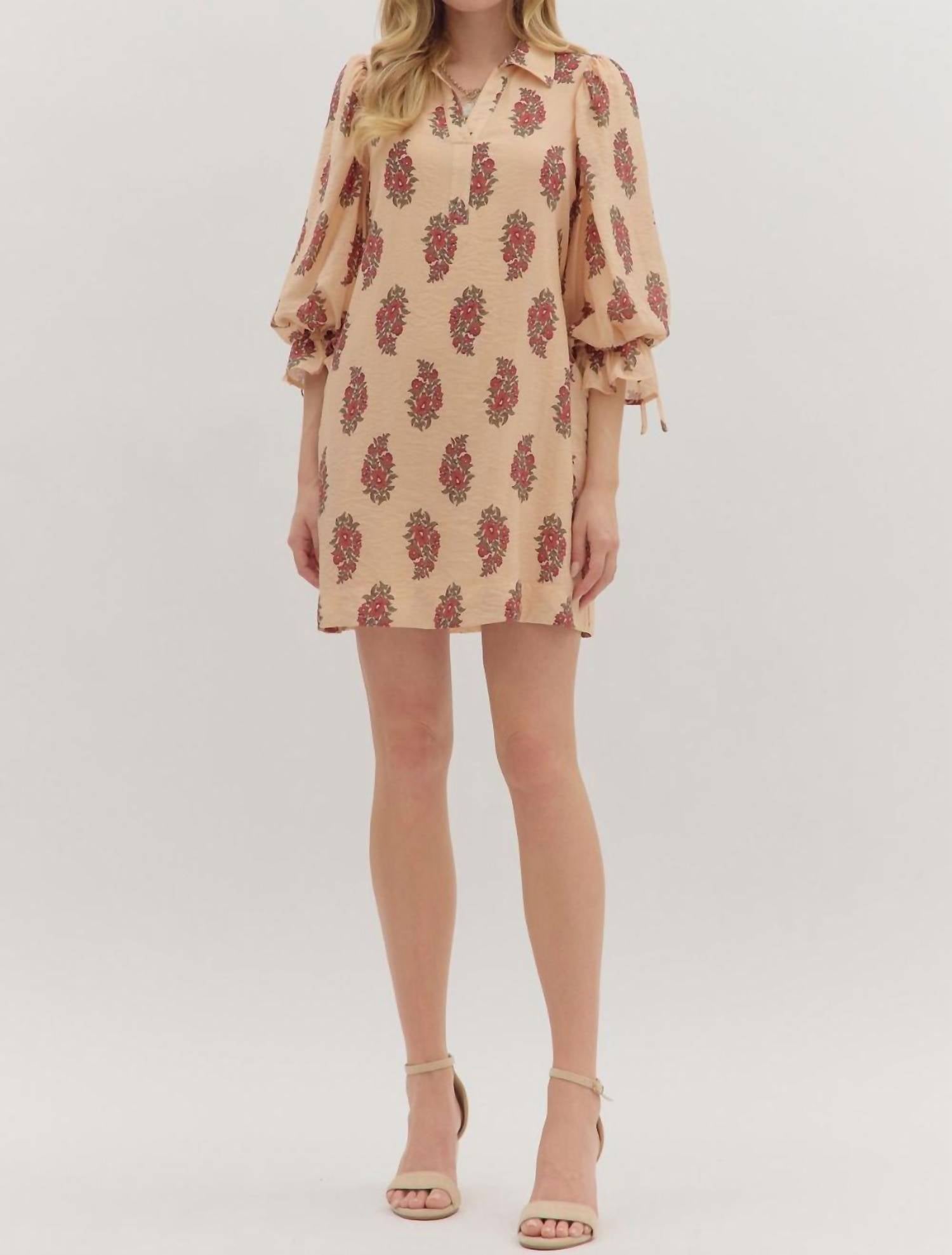 A flattering yet comfortable dress you'll be reaching for season after season. Introducing the Gemma Floral Dress by Entro, an enchanting piece in beige that exudes playful charm. Adorned with a delicate ecru floral pattern, this shift silhouette features long puff sleeves and practical side pockets. Crafted from a soft nylon blend, it includes a tie closure at the cuffs and back waist for a customizable fit. Care is a breeze with machine wash and tumble dry instructions, making it perfect for spring holidays and vacations.