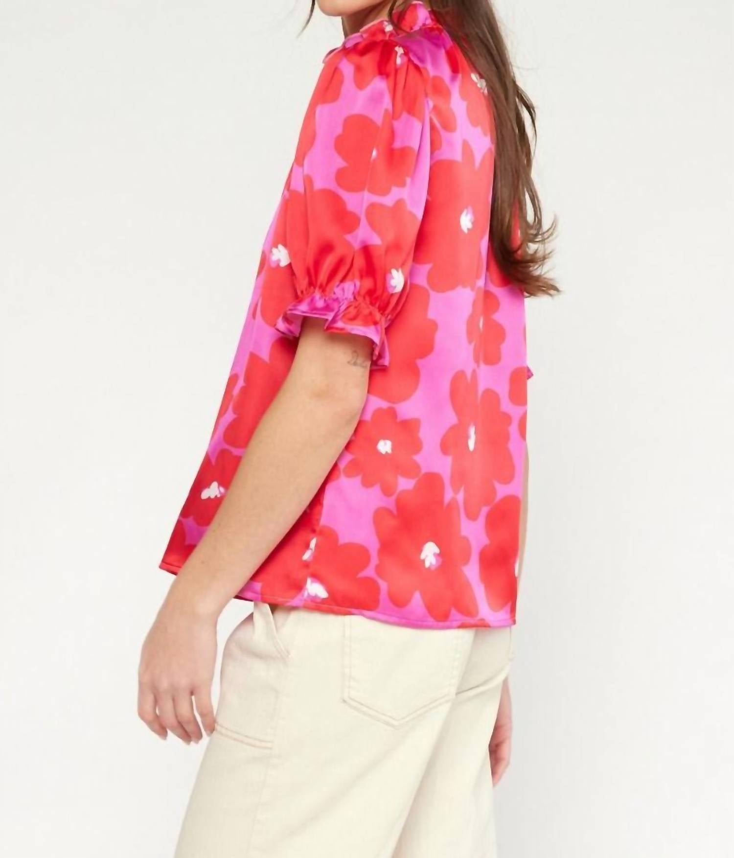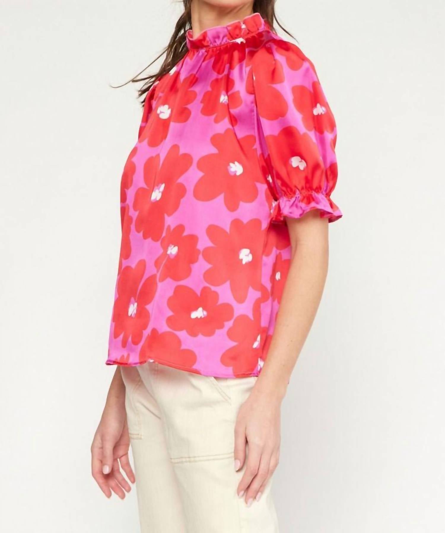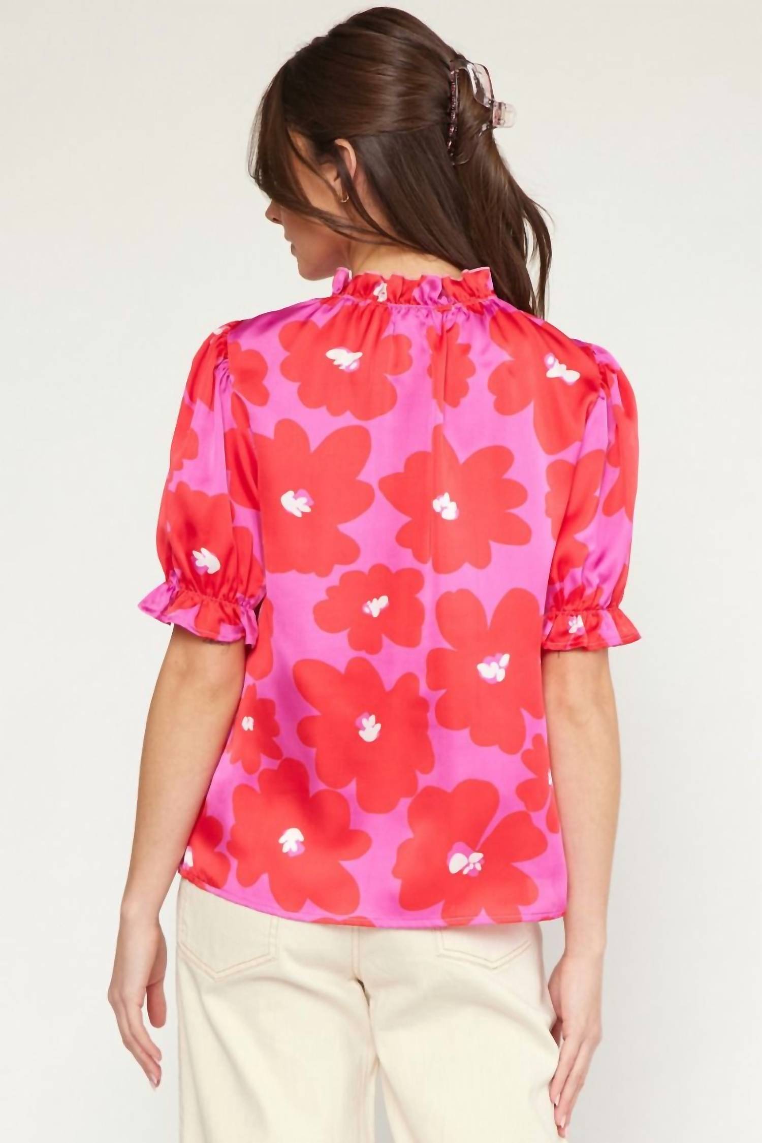 A versatile blouse that works from desk to dinner! The Goodnight Floral Blouse by Entro is a charming addition to your spring wardrobe, ideal for vacations or Mother's Day celebrations. This pink blouse features a floral print with a mock neck and flattering short sleeves that boast a delicate ruffle detail. Crafted from 100% polyester, it offers a lightweight, woven, and non-sheer elegance. For best care, hand wash and line dry. The model is 5'10" and wearing a size small. Available in size small (4-6), medium (8-10), and large (12-14).