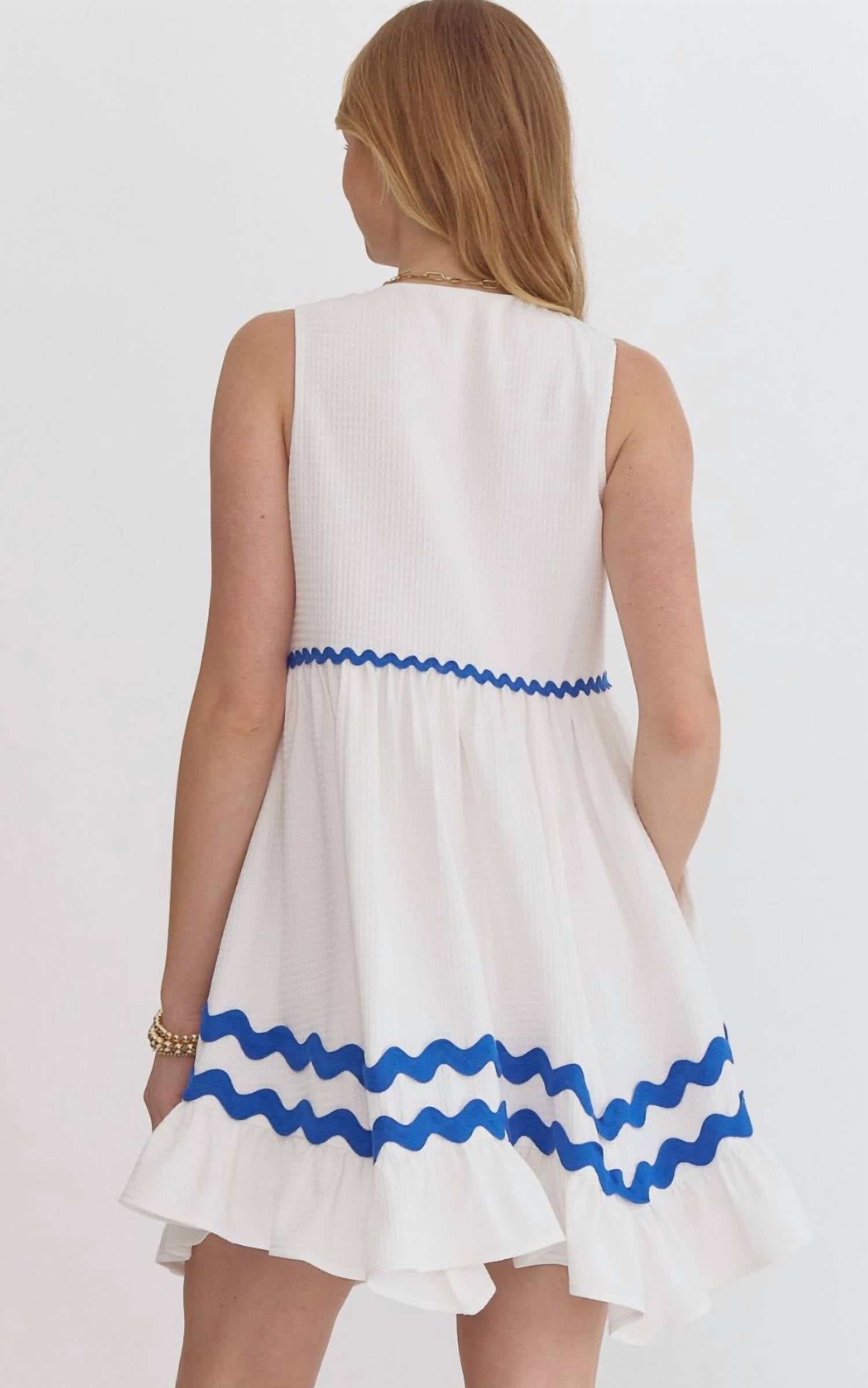 The kind of easy and flattering dress you'll be reaching for all season long. Elevate your wardrobe with the Ingrid Mini Dress by Entro, a stylish choice in crisp white for summer occasions. This sleeveless dress comes in a shift silhouette with a chic V-neckline, featuring a playful ruffled hem and solid contrast trim detailing. Made from a comfortable cotton blend, this dress is designed with practicality in mind, offering a pull-on closure for ease of wear. Perfect for vacation and special events, the Ingrid Dress is your go-to for a sophisticated, minimalist look.