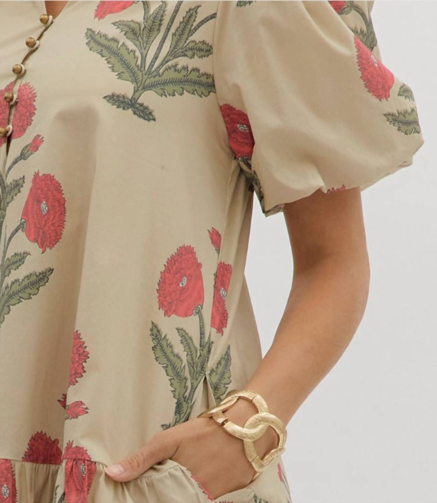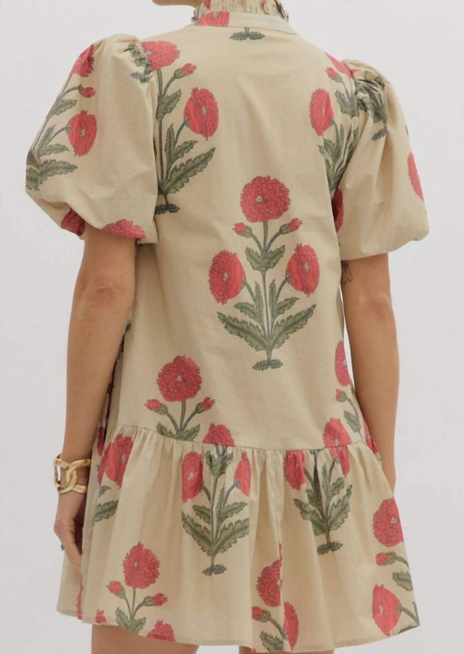 A short and breezy dress for those warmer days. Step into spring with the Entro Mini Floral Dress, a quintessential piece for any vacation wardrobe. This A-line mini dress in ecru features playful short bubble sleeves, a charming ruffle neck, and a flirty ruffle hem. Crafted from 100% cotton, it offers lightweight comfort with a convenient button closure and practical side pockets. Ideal for sunny outings, this dress effortlessly combines boho chic style and practicality, perfect for any Easter celebration. Model is 5'10" and wears a size S.