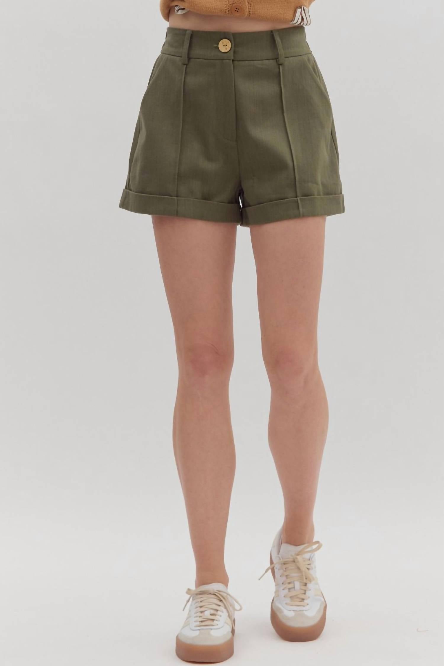 High-waist is here to stay and we especially love this style short. Stay cool and stylish this summer with the Nellie High-Waist Rolled Cuff Shorts by Entro, crafted for comfort and effortless flair. Featuring a flattering high-rise with rolled cuffs, these shorts are made from 100% soft and breathable cotton, ensuring easy wear throughout your summer activities. Designed with a zip closure, they fit true to size in a versatile olive green that complements any outfit. Care instructions suggest hand washing cold, with a recommendation to hang dry, and they are imported for quality assurance.