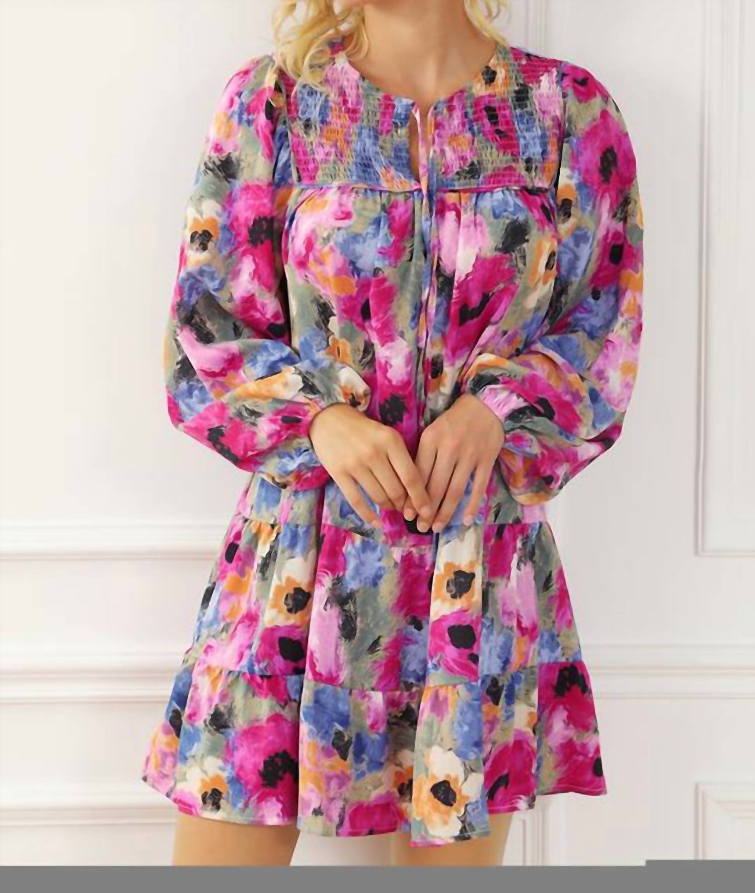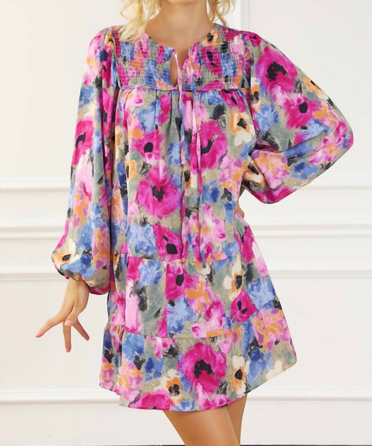 The kind of easy and flattering dress you'll be reaching for all season long. Crafted by Entro, the Orchid Floral Dress is a vibrant embodiment of boho chic style. This mini dress features long sleeves with elastic wrists, a split v-neckline with ties, and smocking details on the front, all rendered in a bold floral pattern. Made from lightweight 100% polyester, it boasts an a-line silhouette complete with practical side seam pockets. Care for this versatile vacation staple by hand washing in cold water and line drying.