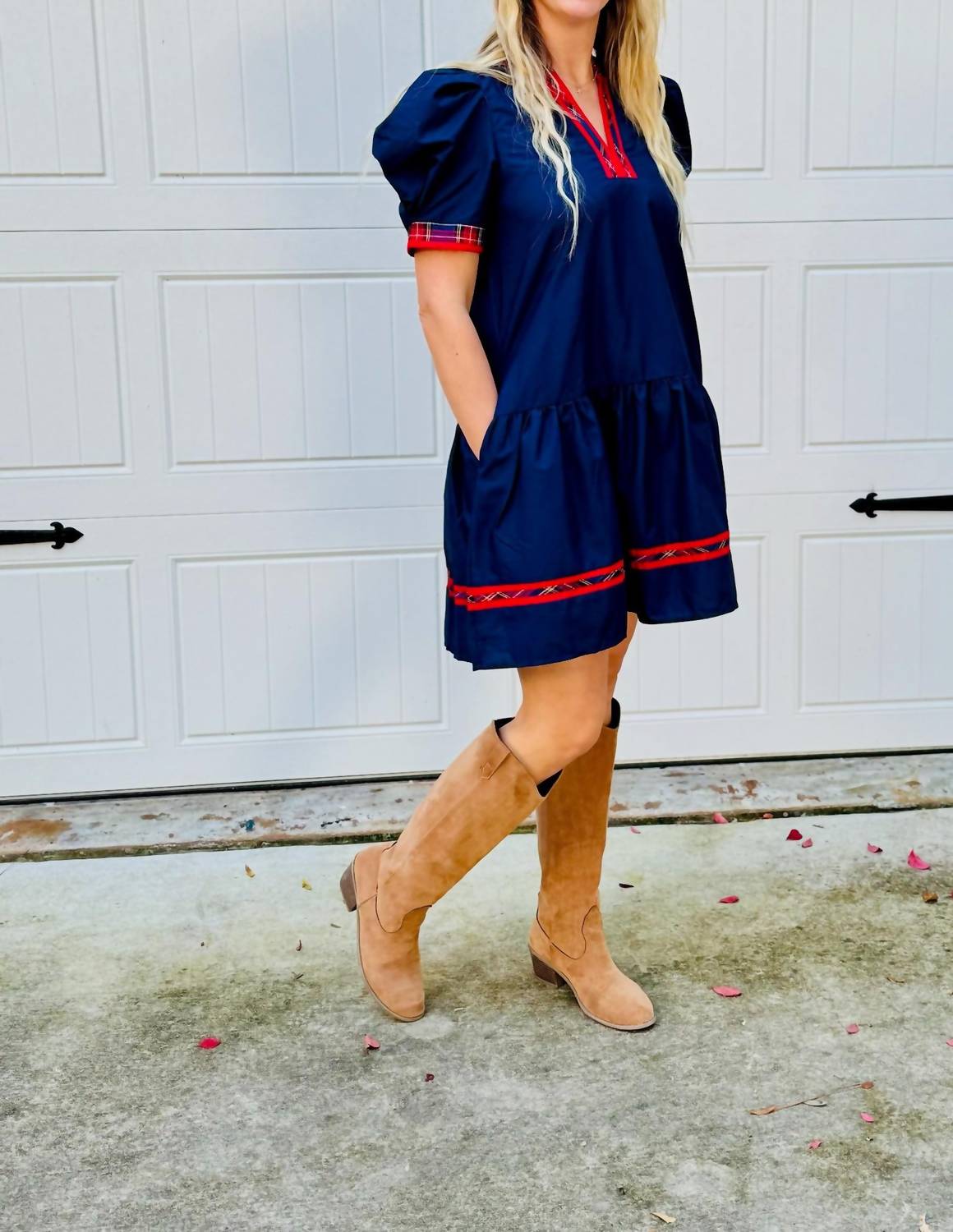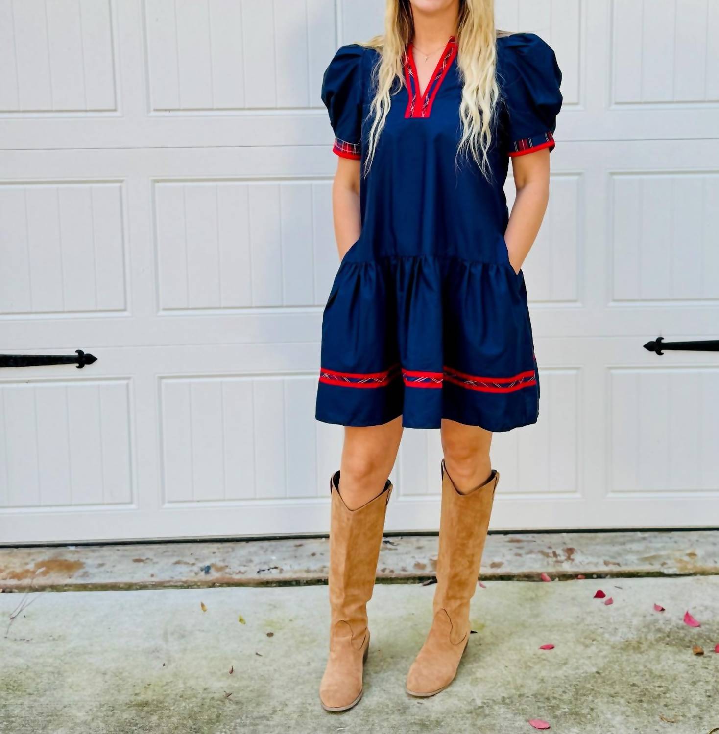 The perfect mini dress for those warmer months. Add a playful twist to your wardrobe with the Peyton Dress by Entro, featuring short puff sleeves and a striking red plaid trim. Crafted from 80% polyester and 20% cotton, this navy shift dress is perfect for any spring occasion. Designed with a practical touch, side pockets add convenience, while the pull-on closure ensures easy wear. Care for it by hand washing in cold water and line drying. Available in sizes small, medium, and large.