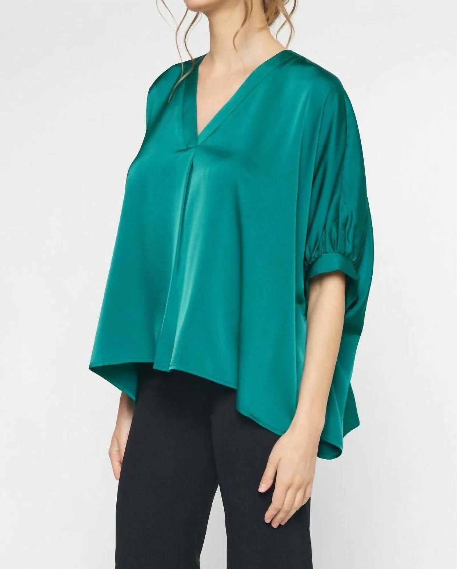 A timeless blouse that will never go out of style. Elevate your wardrobe with the Satin V-neck Placket Blouse by Entro, a chic statement piece in a luxurious green hue. Featuring elegant elbow sleeves and a relaxed oversized silhouette, this blouse showcases a sophisticated V-neckline and placket detailing. Crafted from 100% polyester, this lightweight tunic is made in the USA and offers a slight high-low hem for added style. Closure: Pull on. Care: Hand wash or dry clean. Available in plus sizes with a bust of 80" to 84" and a length of 29".