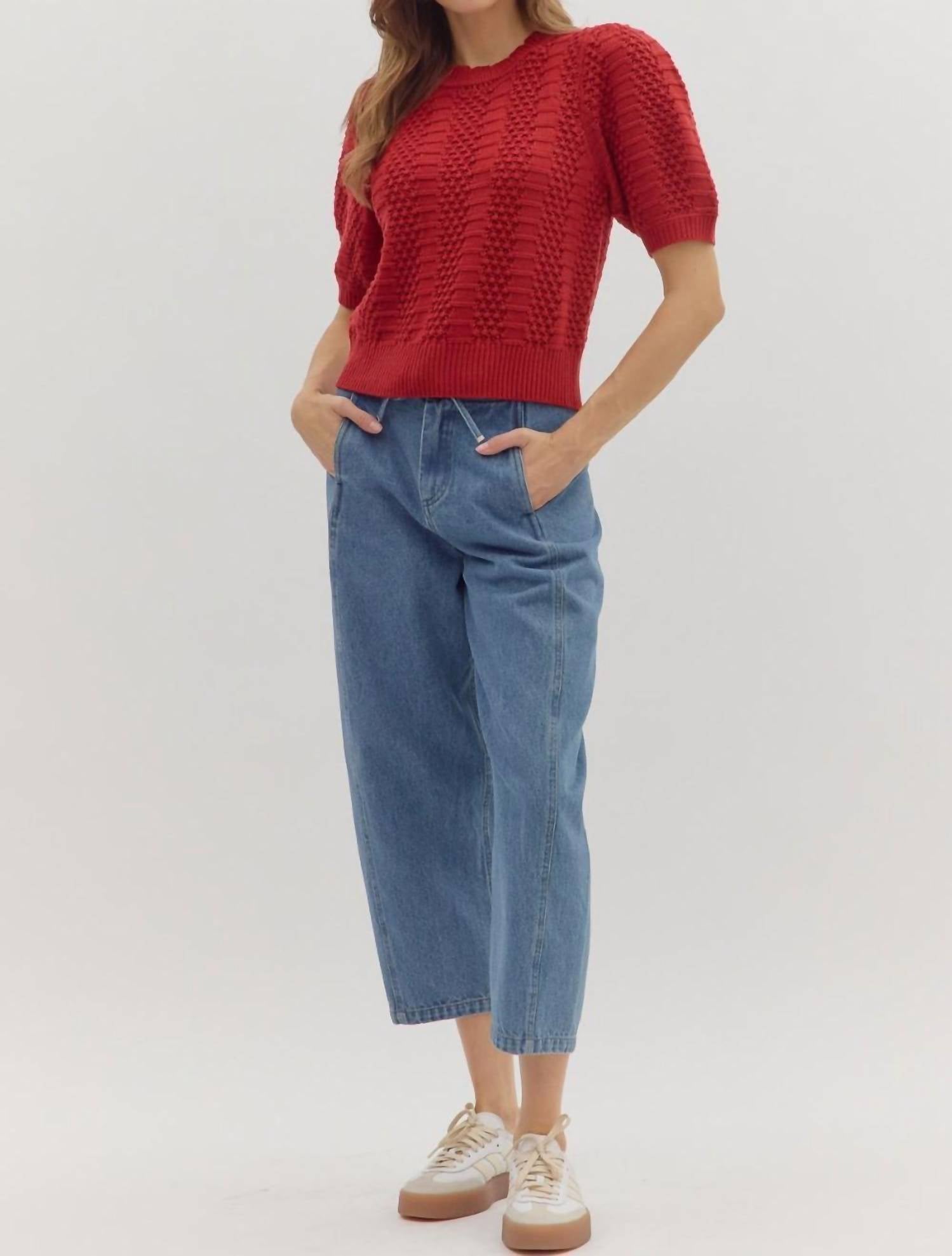 Pair this with your favorite jeans and slides for your next girls night out. This short-sleeved pullover top is made from 100% acrylic sweater knit and features a multi-pattern solid design. The garment is unlined, non-sheer, and lightweight.