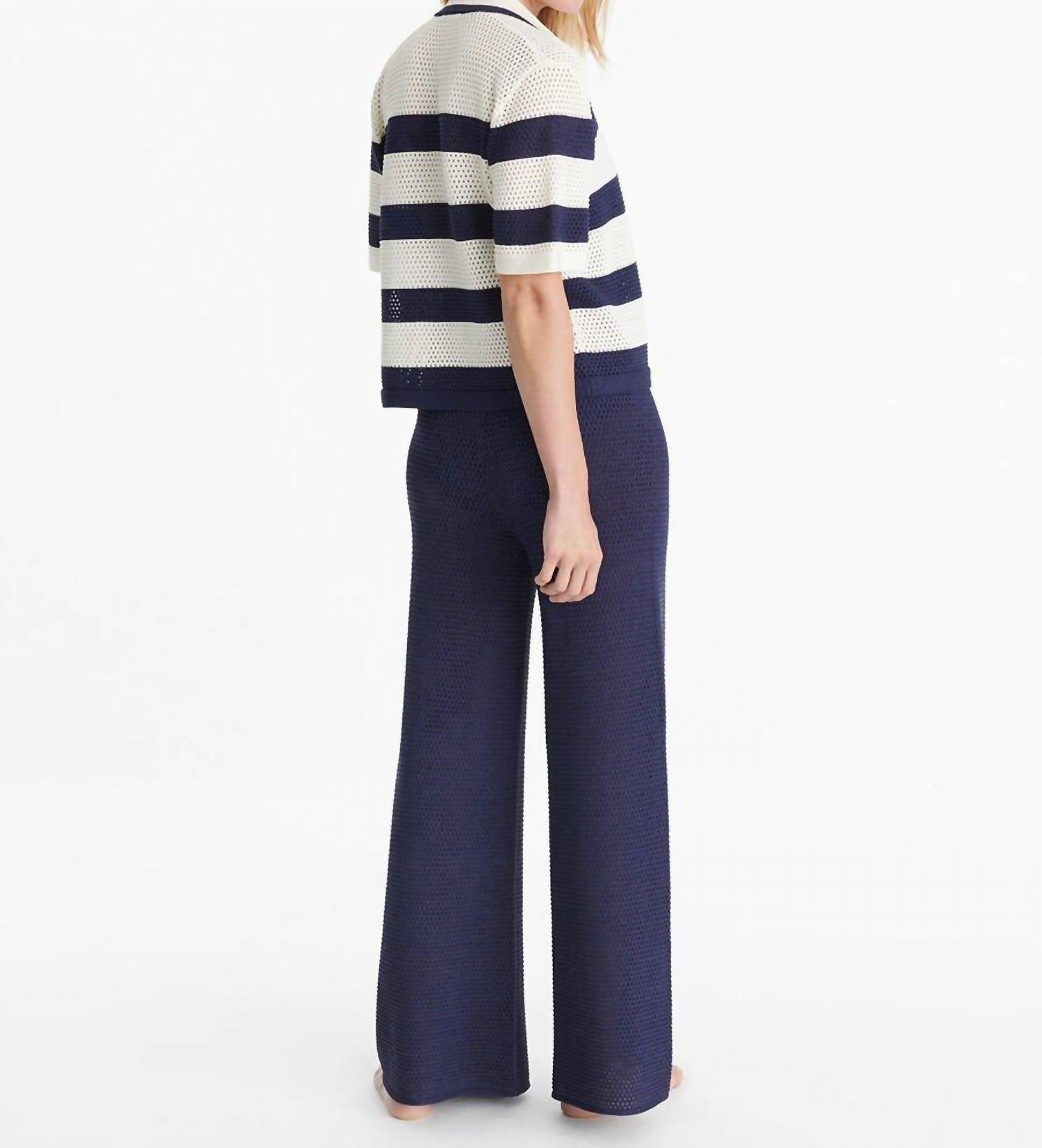 Perfectly tailored and soft to the touch. Introducing the Mouette Top by ERES, a sophisticated choice for a touch of retro charm. This women's short sleeve top is crafted from a cotton blend and features openwork knit fabric in a striking stripe pattern, underscoring shades of blue and ecru. Designed with a polo collar and ribbed edging at the sleeves and bottom hem, this piece exudes timeless elegance. Made in Italy, it offers a button closure for versatile styling and should be dry cleaned for best care.