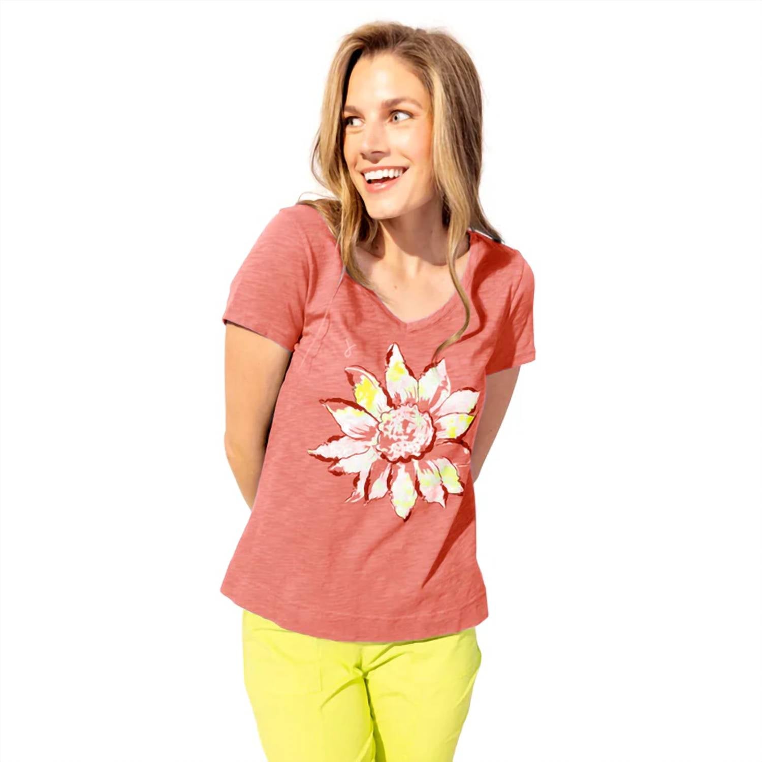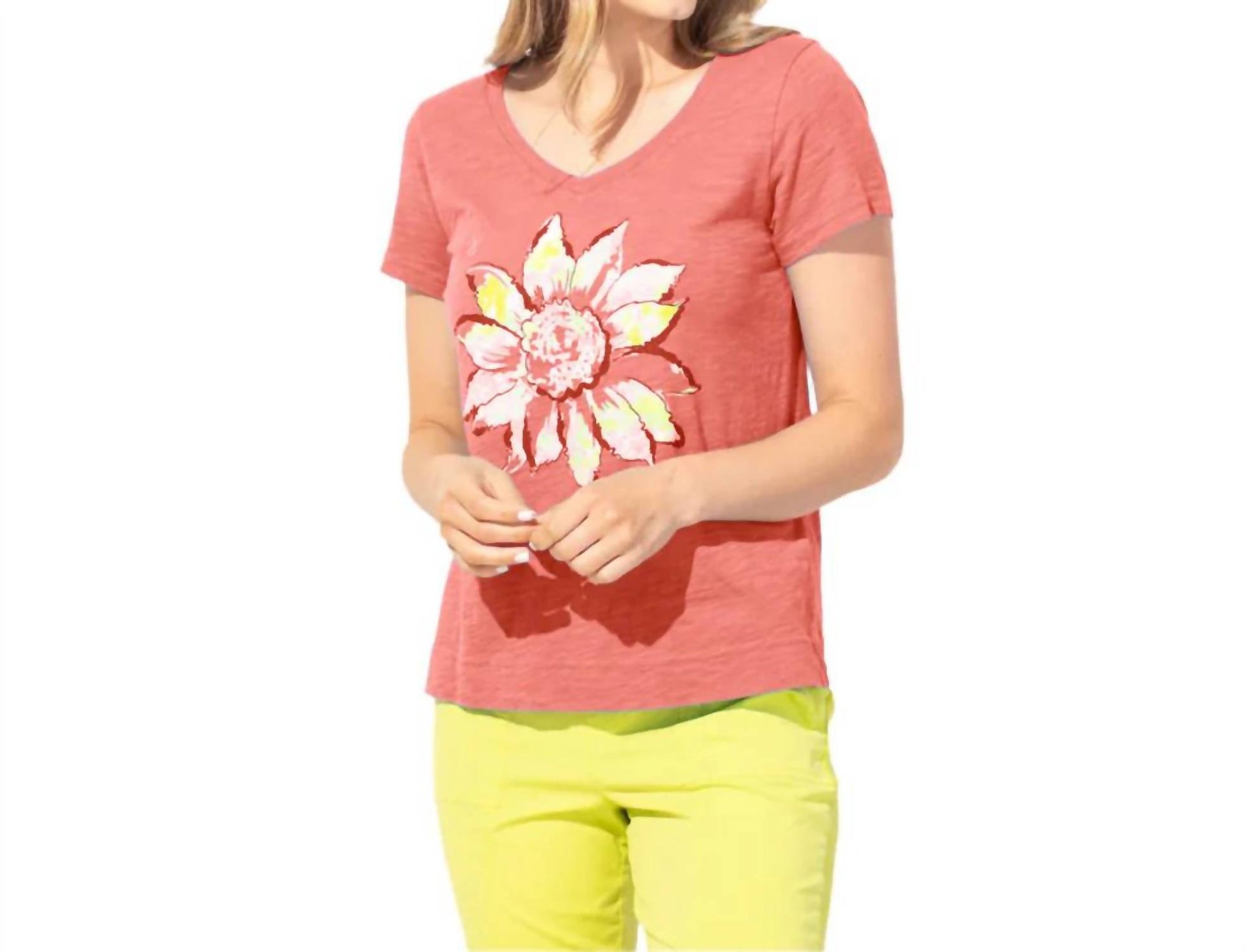 Look no further, you just found your perfect tee! Fly into style with Escape by Habitat's Sunflower V Neck Tee. Made from soft, breathable cotton slub, this sunflower shirt will keep you cool and comfortable while adding a touch of whimsy to your wardrobe. Sunflowers represent many things including positivity and happiness. This base tee with painted sunflower art is the one you’ll reach for over and over. Escape by Habitat's Peruvian Cotton is made in Peru from the finest cotton in the world, known for its softness, durability, and strength. Slub-textured yarns give their tees a unique, nuanced texture. Perfectly relaxed, not baggy with a flattering cap sleeve and side vents for freedom of movement. A metered soft V neckline with tiny edge stitching says, “I’m not just any tee. I’m special.” V-Neckline Short Cap Sleeve Mid-Length Straight Hemline Fabric Contents: 100% Cotton Care Instructions: Machine wash cold, inside out with like colors. Do not bleach. Tumble dry low. Cool iron on reverse side if needed. Fit: Runs Small, We Recommend Sizing Up.