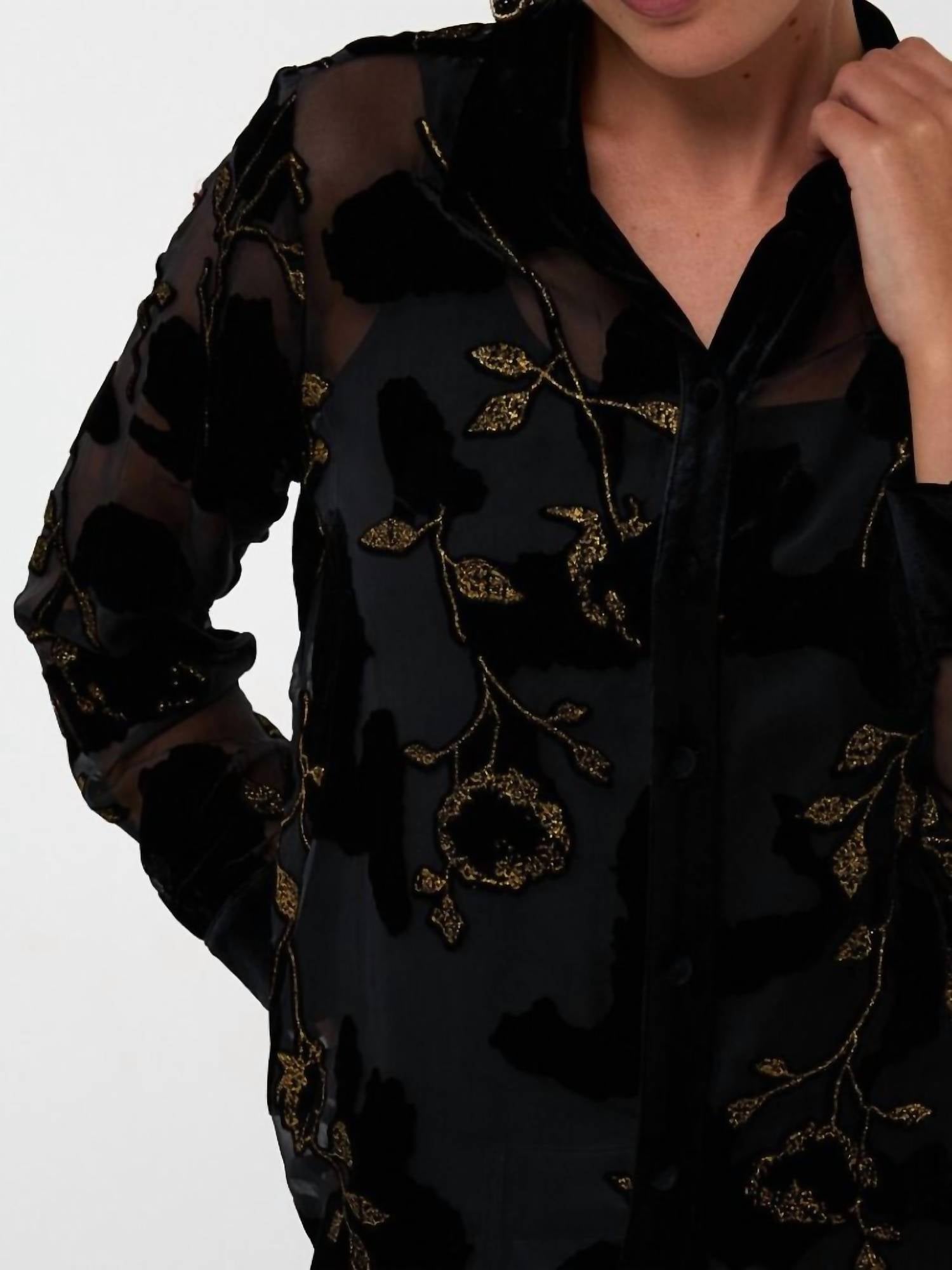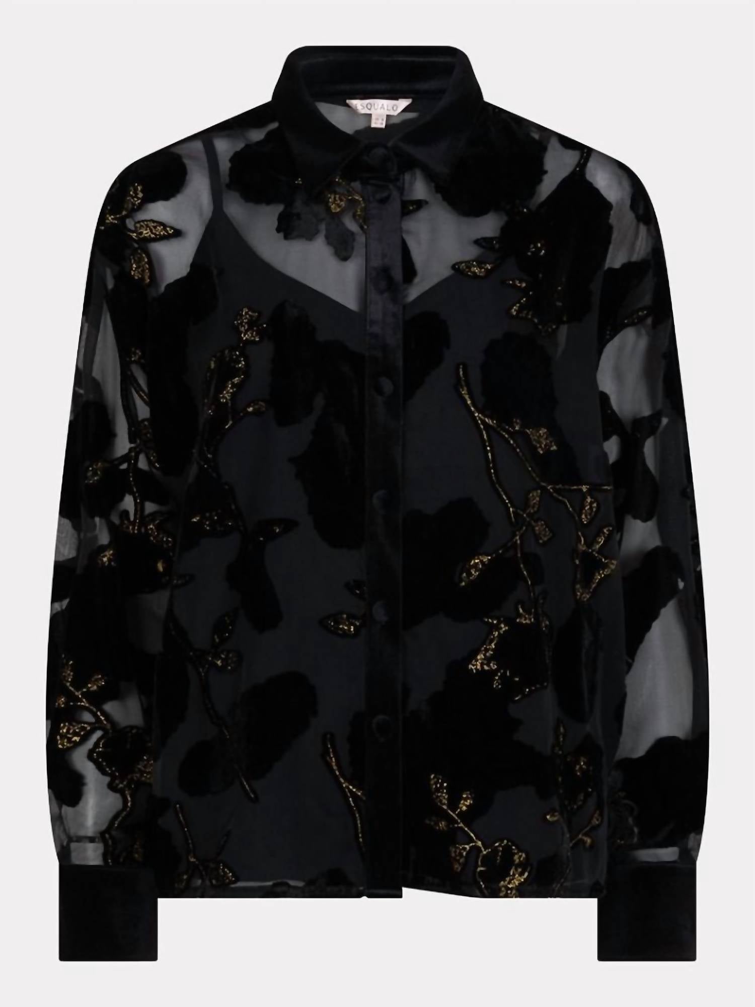 Pair this with your favorite jeans and slides for your next girls night out. Discover the Burnout Flower Blouse by ESQUALO, a captivating piece in black adorned with velour flowers and glittering gold lurex for a dazzling effect. This blouse features long sleeves and includes an undershirt for added coverage. Composition: Shell is crafted from 80% Viscose and 20% Brocade, while the lining is 95% Cotton and 5% Spandex. Perfect for adding a touch of glamour to your spring wardrobe.