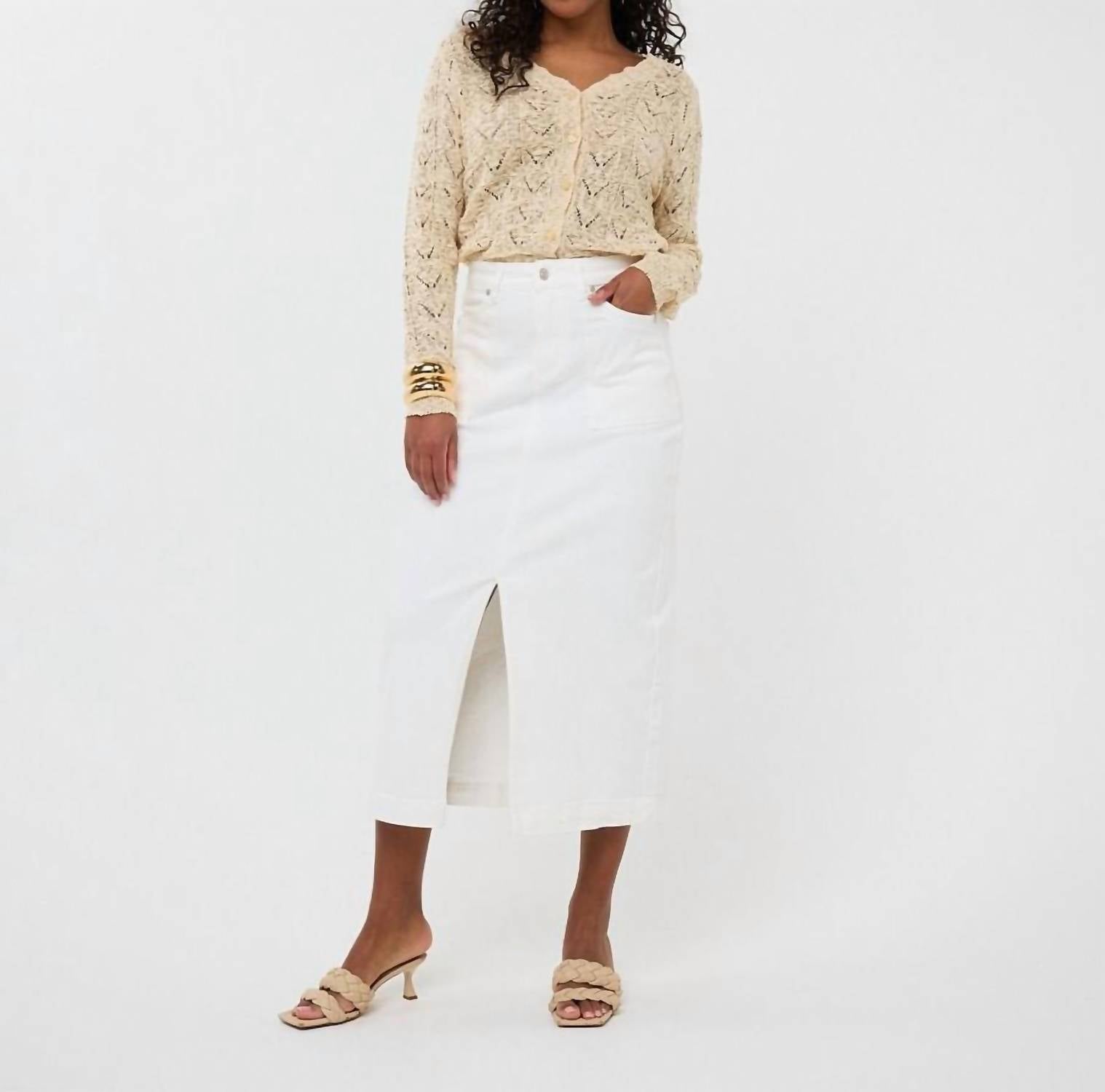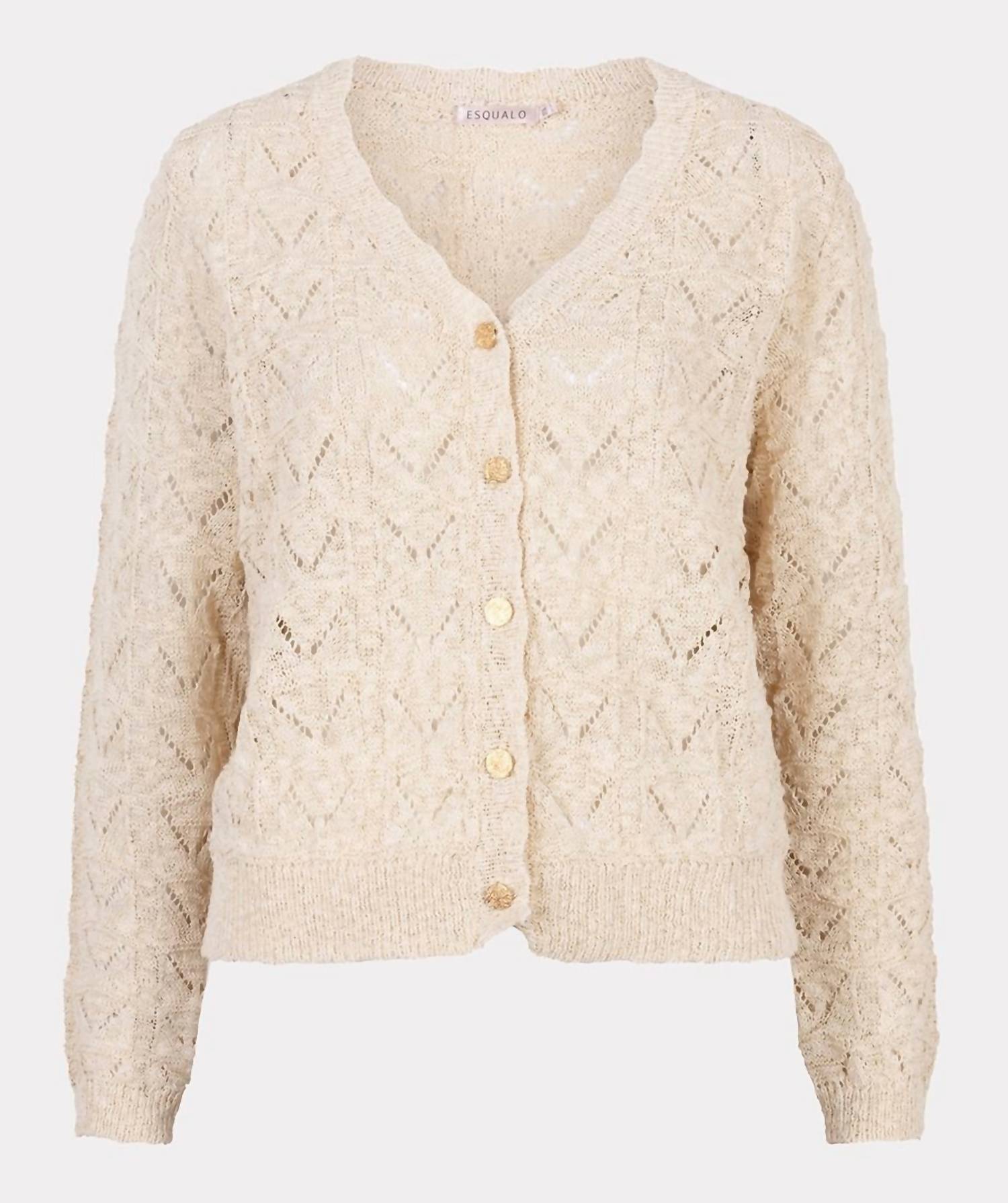 Elevate your wardrobe with the Esqualo Fancy Knit Cardigan in Light Sand, a sophisticated blend of style and comfort perfect for fall. This women's cardigan features long sleeves and a v-neck, crafted from a textured cotton blend composed of 79% cotton and 21% nylon. With a chic, gold button closure, it reflects the timeless appeal of 90s fashion. The cardigan can be styled in various ways, making it a versatile piece for your travel wardrobe. Model is 1.73m and wears size S.
