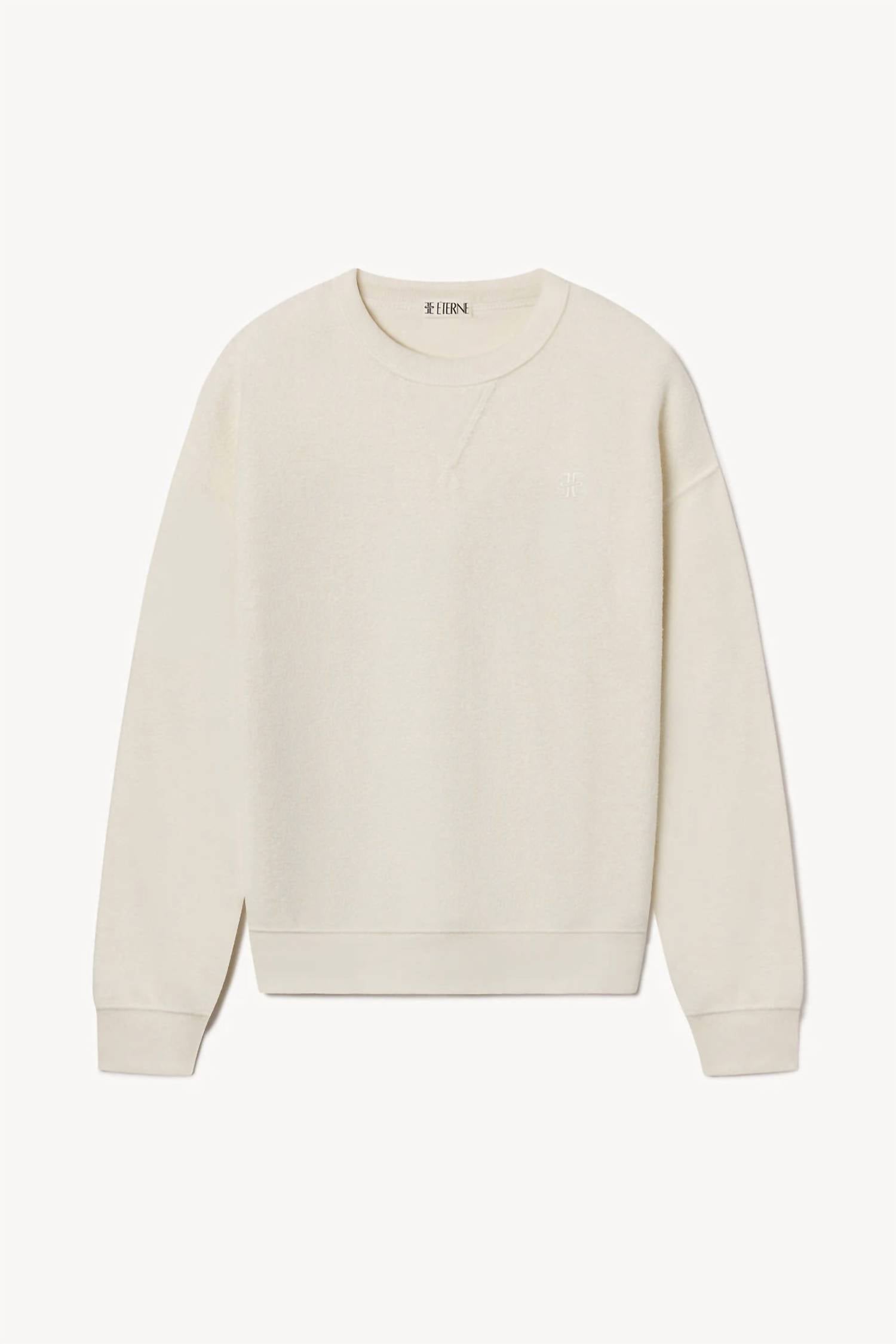 Whether you're running around town or lounging at home, this sweatshirt works for both. Introducing the Classic Crew Sweatshirt by Éterne, a must-have for effortless style and comfort. This women's long sleeve sweatshirt is made from 100% cotton, offering a cozy and relaxed fit with an exposed brushed fleece interior. The cream-colored, minimalist design and solid crewneck make it versatile for everyday wear. Originating without a specific country of origin, care is straightforward with machine wash and tumble dry instructions. Closure is a simple pull-on style.