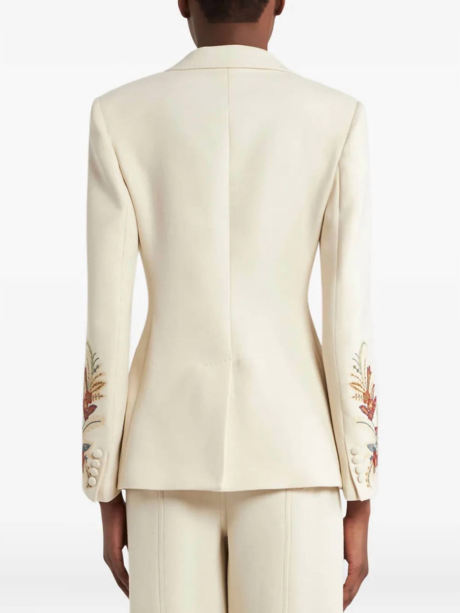 Tailored to perfection, this blazer will be your go-to jacket for years to come. Introducing the Single Breasted Jacket With Embroidered Sleeves by ETRO, tailored in a sophisticated beige wool blend. It features long embroidered sleeves, covered button cuffs, and practical front and breast patch pockets. The jacket's closure is a single breasted two button style, complemented with peak lapels and a stylish stripe lining. Composed of 52% polyester, 44% wool, and 4% elastane, with an embroidery of 100% polyester and a lining made of 52% viscose and 48% acetate. Designed for cocktail parties and fall workwear, it's machine washable and suitable for tumble drying.