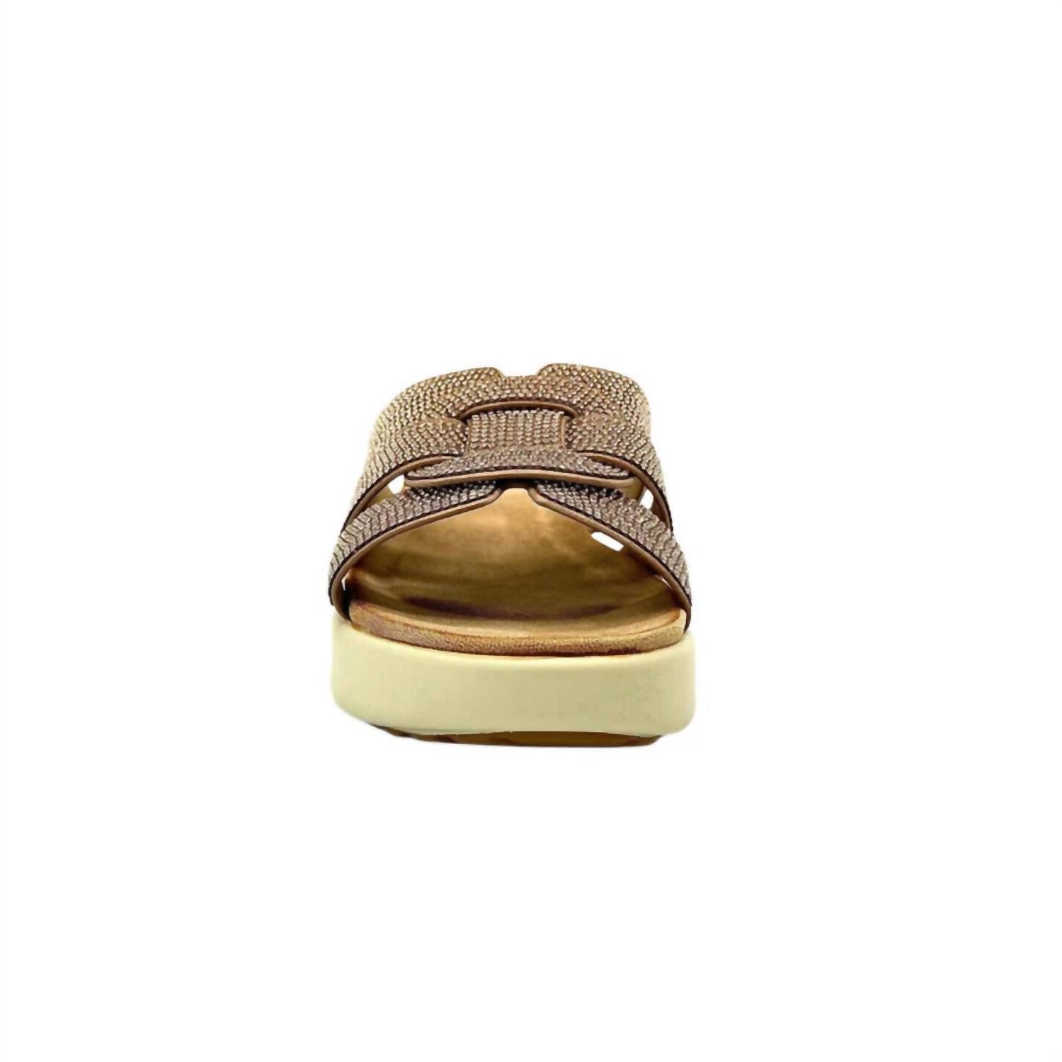 Dresses, denim, shorts... these wedges go with just about anything. Introducing the Women's Slide Wedge by Exe, a perfect blend of comfort and style in charming rose gold. Designed with a flat heel and an open toe shape, these sandals are ideal for spring holiday parties. The platform sandal features bedazzled studs for a touch of glam, combined with a soft insole for everyday wear. Elevate your seasonal wardrobe with these versatile wedges.