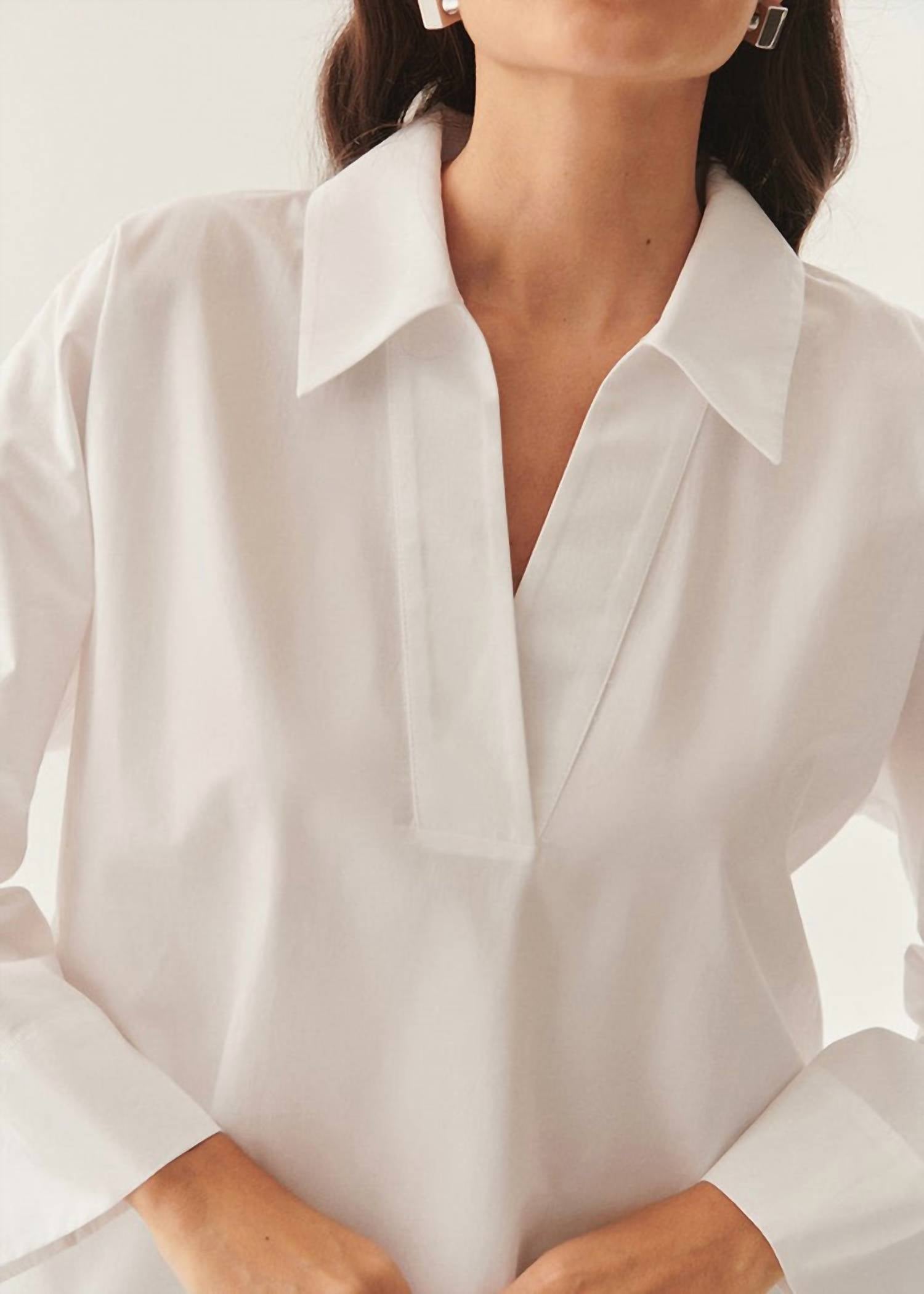 Pair this with your favorite jeans and slides for your next girls night out. The Lucia Collared Poplin V-neck Blouse by EXQUISE offers a perfect blend of style and comfort for your travel adventures. Crafted from high-quality cotton, this solid white blouse features long sleeves and a chic collar for a sophisticated look. Designed with a convenient pull-on closure, it's an ideal choice for a spring workwear ensemble. 100% cotton.