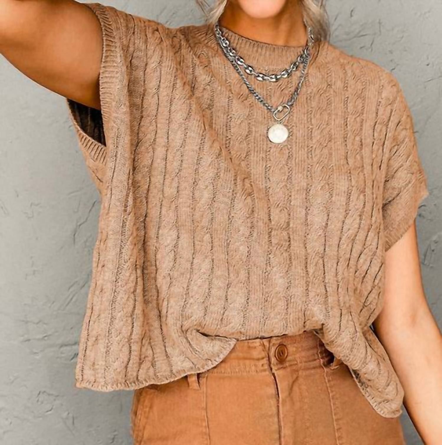 Stay warm and stylish in this versatile and effortlessly cool knitwear staple. Wear it alone or layered, it's the perfect sweater for the season and you'll wish you had it in every color. Elevate your holiday party look with Fashionworks' Crew Neck Cable Knit Short Sleeve Sweater in Light French Beige. This sweater features a stylish textured pattern, perfect for achieving a minimalist trend this winter. Crafted from a soft 55% Acrylic, 45% Cotton blend, it offers comfort and easy wear with a pull-on closure. Ideal for women who appreciate simplicity with an elegant touch.