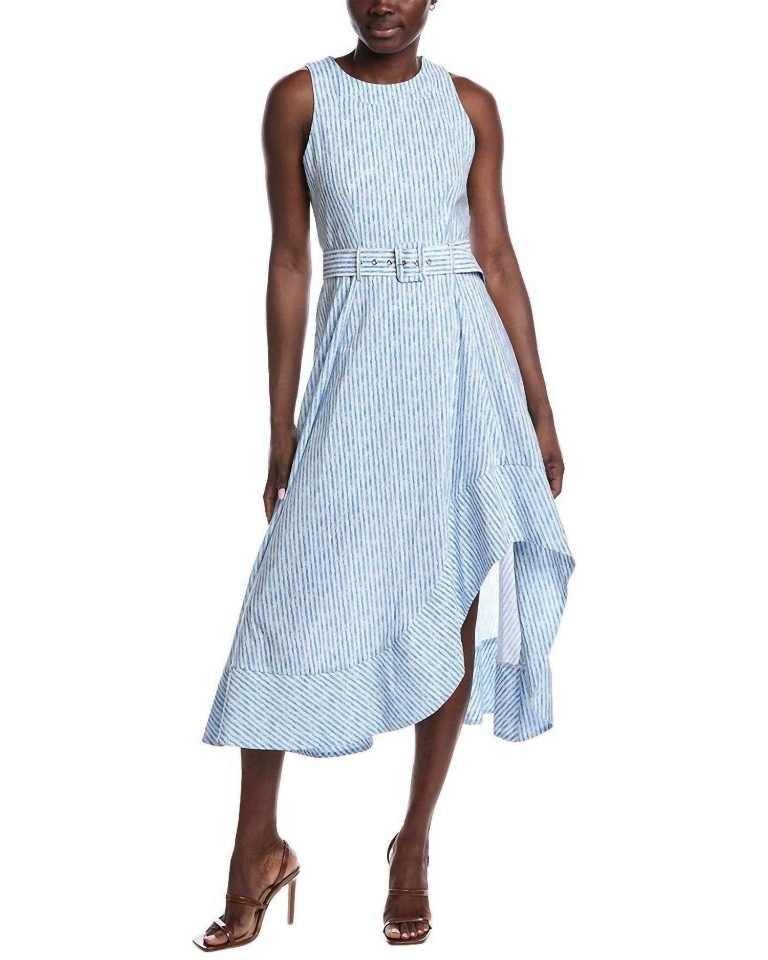The perfect length dress does exist. Introducing the Belted Striped Sleeveless Midi Dress by Fate, a chic piece perfect for summer gatherings and casual outings. This fit and flare dress features playful blue stripes and a flattering scoopneck, enhanced by a stylish belt. Garment Length: Midi. Closure Type: Zip closure. Designed for the trend of Quiet Luxury, it's an effortlessly cute addition to any woman's wardrobe.