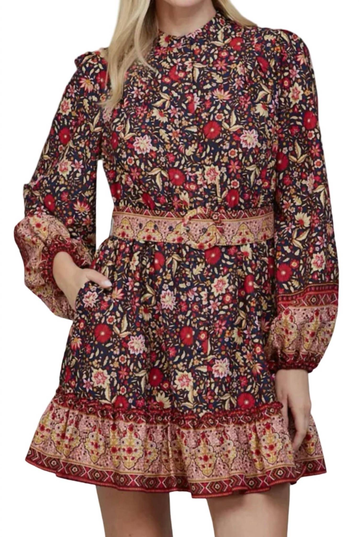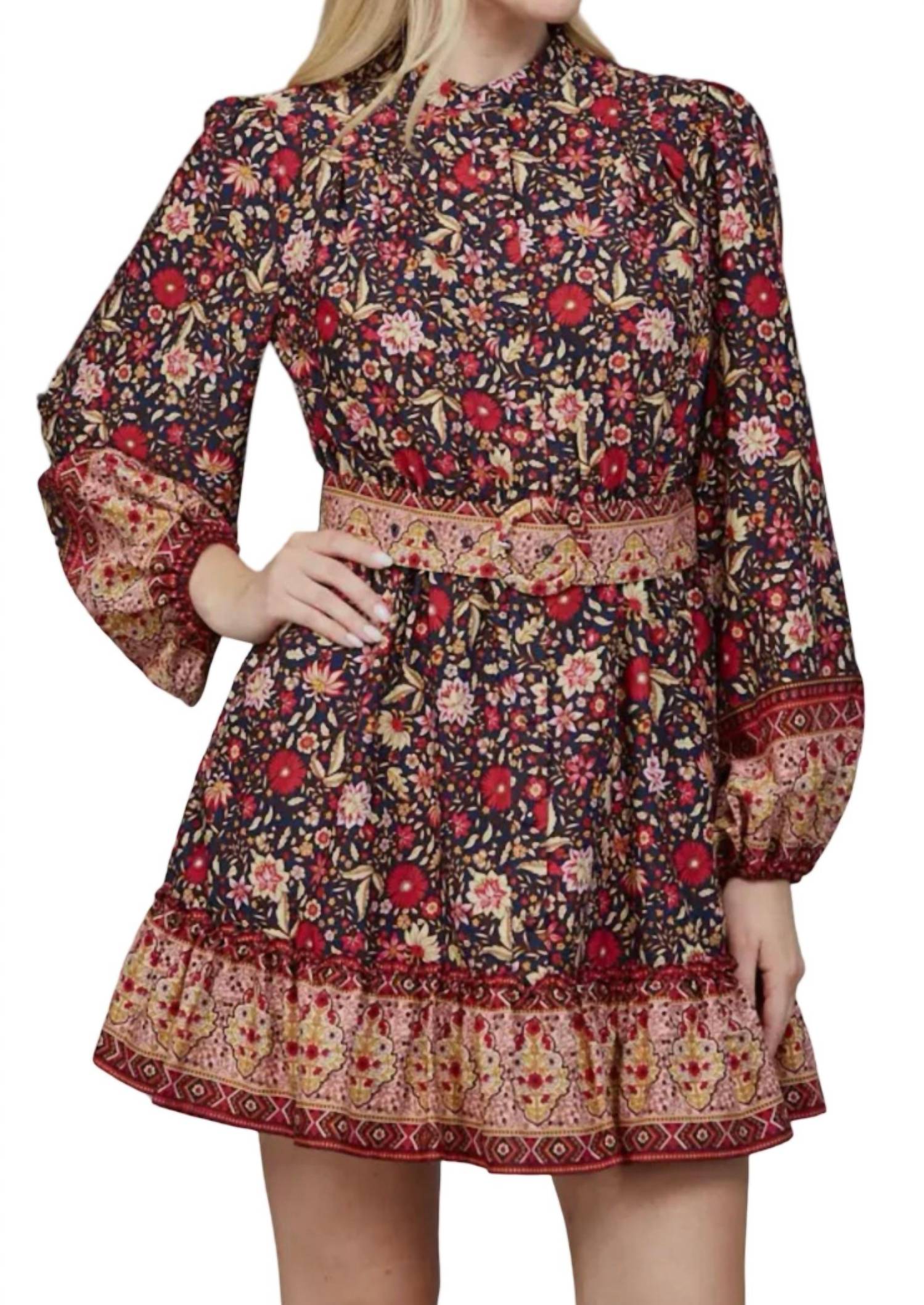The perfect mini dress for those warmer months. Introducing the Border Print Belted Button Down Mini Dress by Fate, perfect for your holiday party ensemble. This mini dress features long sleeves and a sophisticated mockneck, beautifully adorned with a multi-colored floral pattern. Designed with an A-line silhouette and functional pockets, it offers both style and practicality. Closure: Button closure with a chic belt detail.