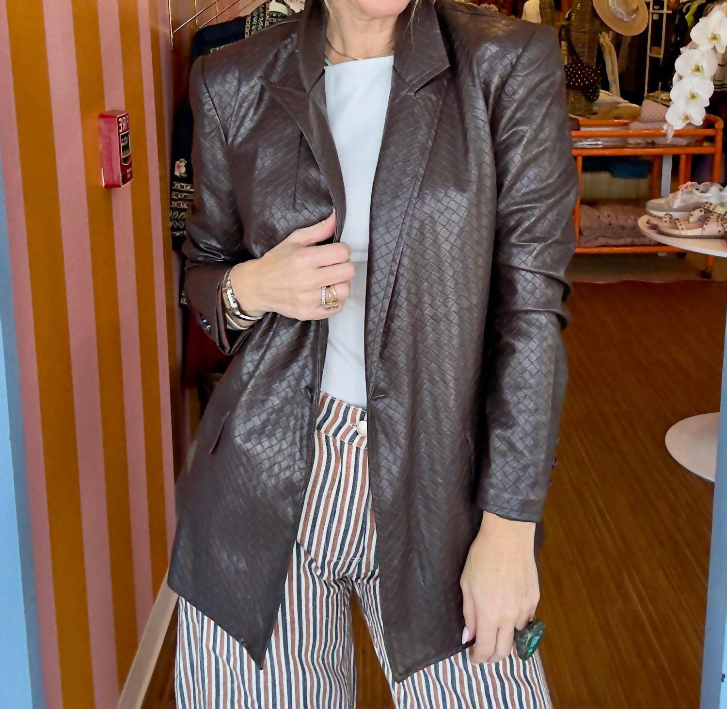 A blazer so versatile you can wear it to the office or pair it with jeans for a more casual look. Elevate your style with the Criss Cross Faux Leather Blazer by Fate, a designer-inspired piece in a deep chocolate brown. This minimalist blazer features long sleeves and a striking woven pattern, making it an ideal addition to your fall wardrobe. Material: Premium Faux Leather. Please note, it does not include pockets and lacks a lining for a lightweight feel. Perfect for engagements and versatile seasonal styling.