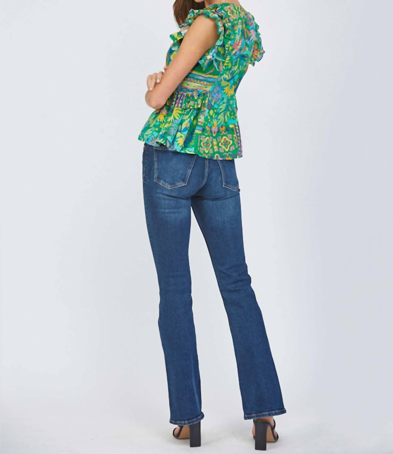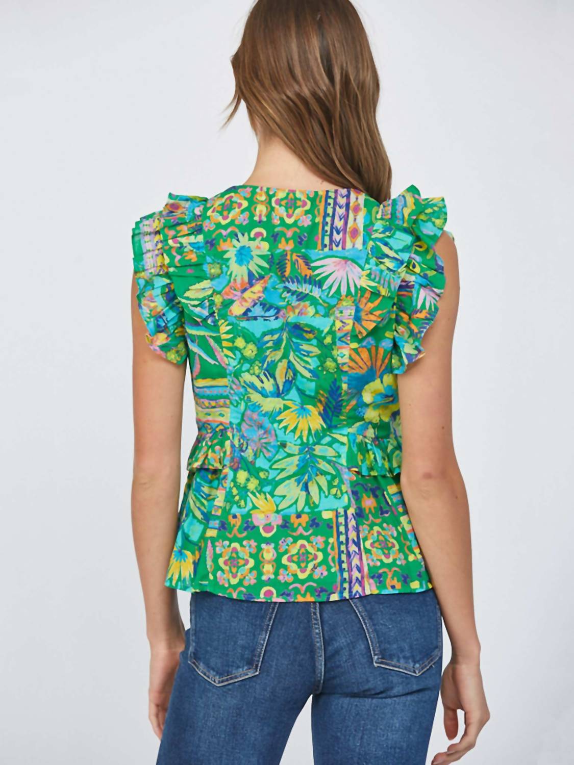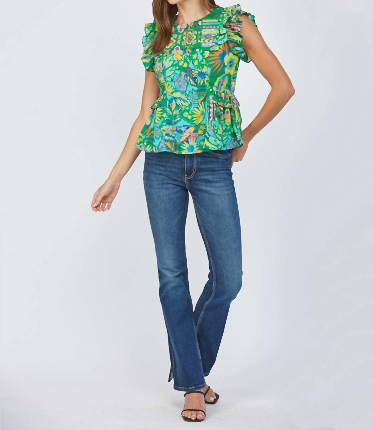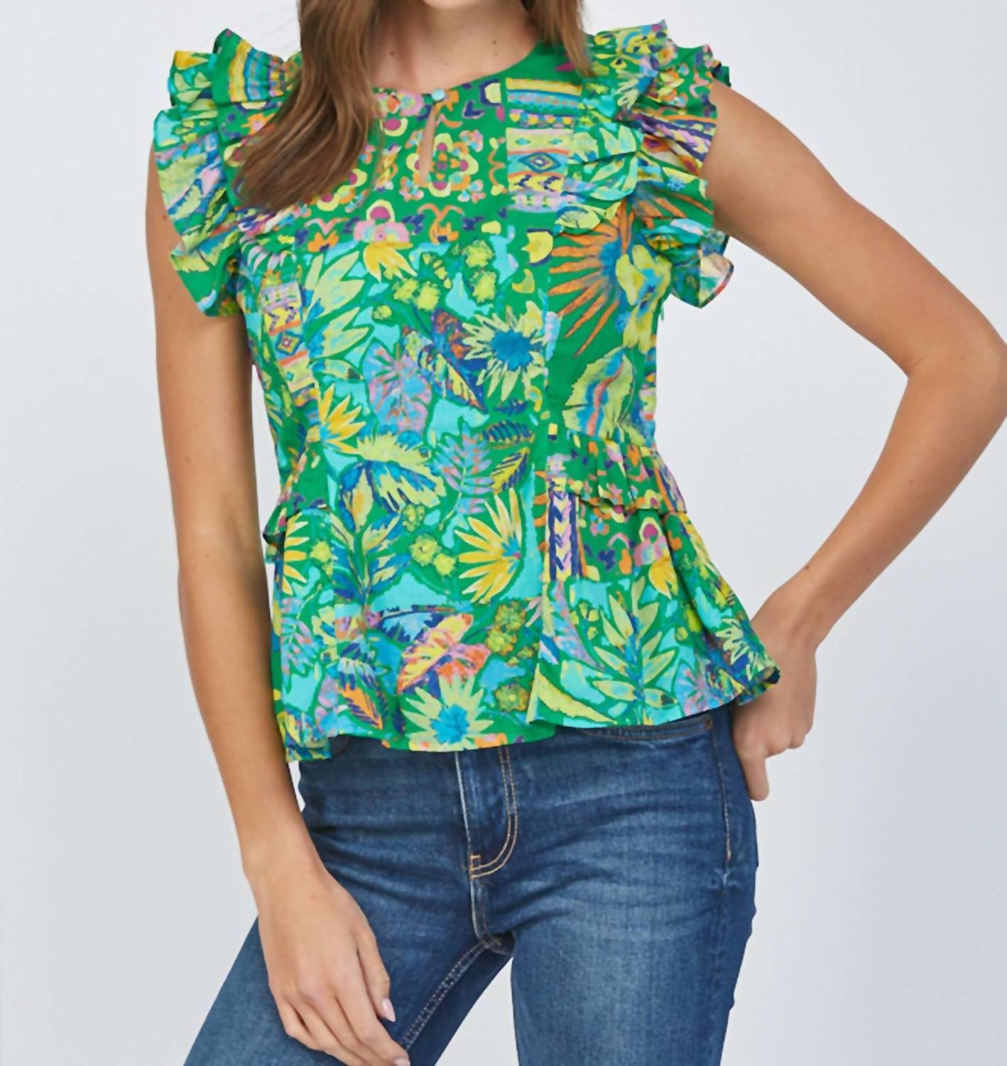 A versatile blouse that works from desk to dinner! Embrace bold style with the Ruffle Cap Sleeve Peplum Top by Fate, featuring a vibrant green floral print. This short-sleeve top is crafted from a lightweight cotton blend, offering summer-ready comfort in a playful peplum silhouette. Detailed with ruffle sleeves and a flattering crew neckline, it's perfect for pairing with high-rise denim.