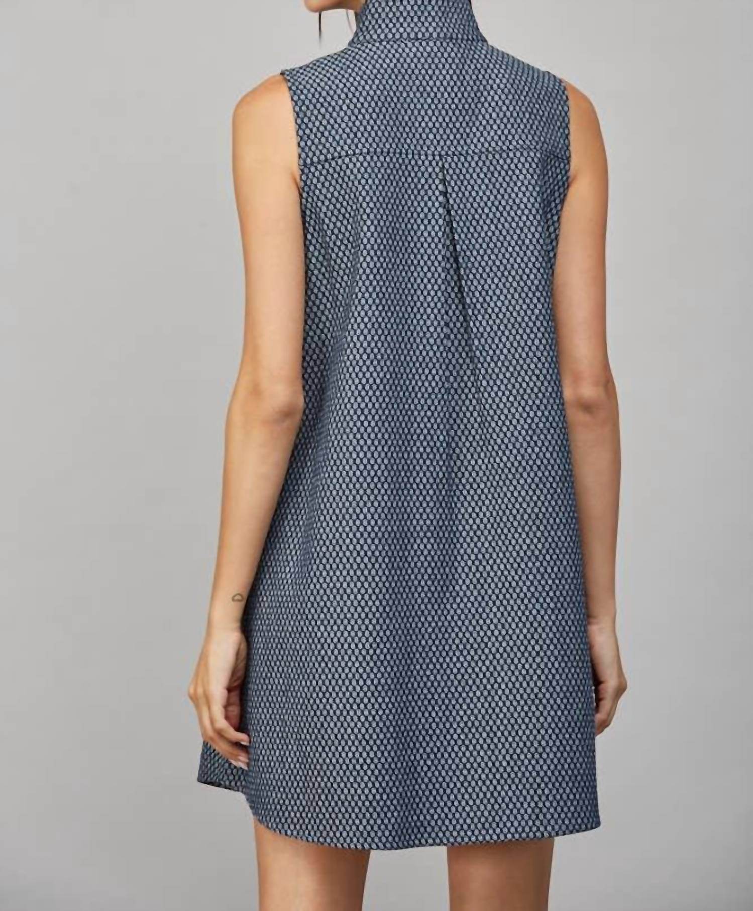 The kind of easy and flattering dress you'll be reaching for all season long. Discover the effortless elegance of the Stand Collar Mini Shift Dress by Fate, an ideal choice for summer cocktail parties. With its sleeveless silhouette and structured stand collar, this navy dress provides a polished and modern look. Made from 100% cotton with a subtle textured fabric and a relaxed A-line shape, it hits above the knee and features convenient side pockets. Closure: Full button front. Care: Hand wash and line dry. Perfect for minimalist occasions, this polka dot dress is designed to keep you comfortable and stylish.