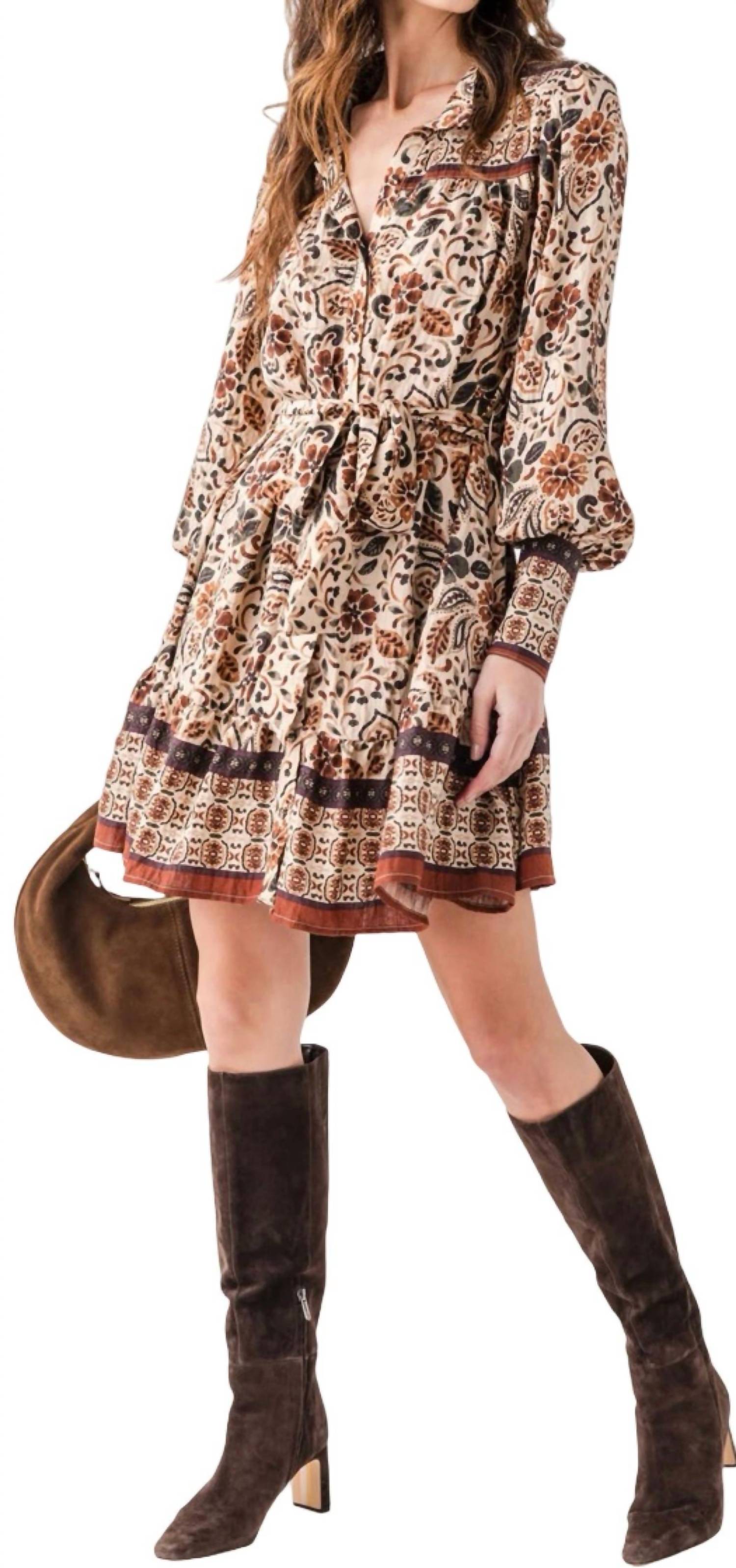 The kind of easy and flattering dress you'll be reaching for all season long. Introducing the Tiered Mini Dress With Pintuck Neckband by Fate, a boho chic piece perfect for fall. This shift silhouette dress features long sleeves and a floral pattern in cream and brown. The intricate pintuck neckband and self belt add a touch of elegance, complete with a button closure for easy wear. Care instructions are not specified.